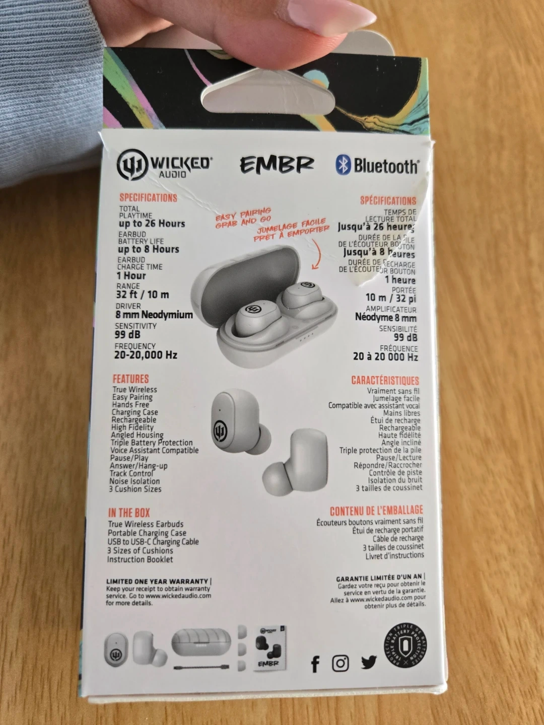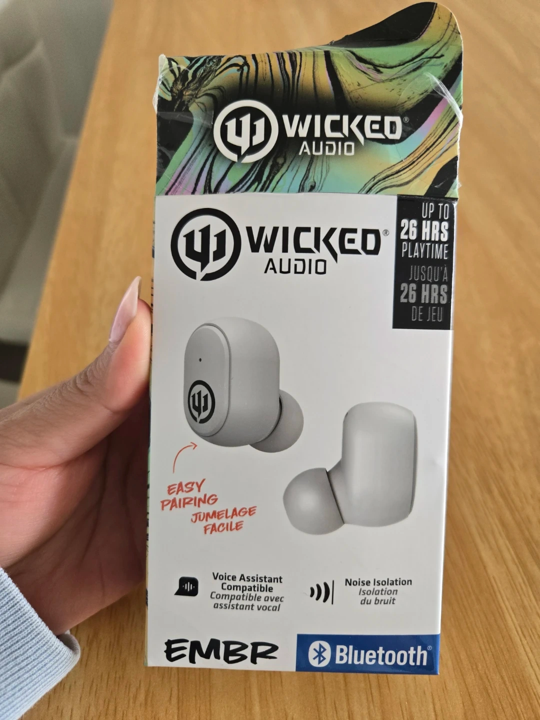 These Wicked Audio EMBR earbuds offer up to 26 hours of total playtime. They feature true wireless connectivity with easy pairing and noise isolation. The package includes the portable charging case, USB-C charging cable, and three sizes of cushions.