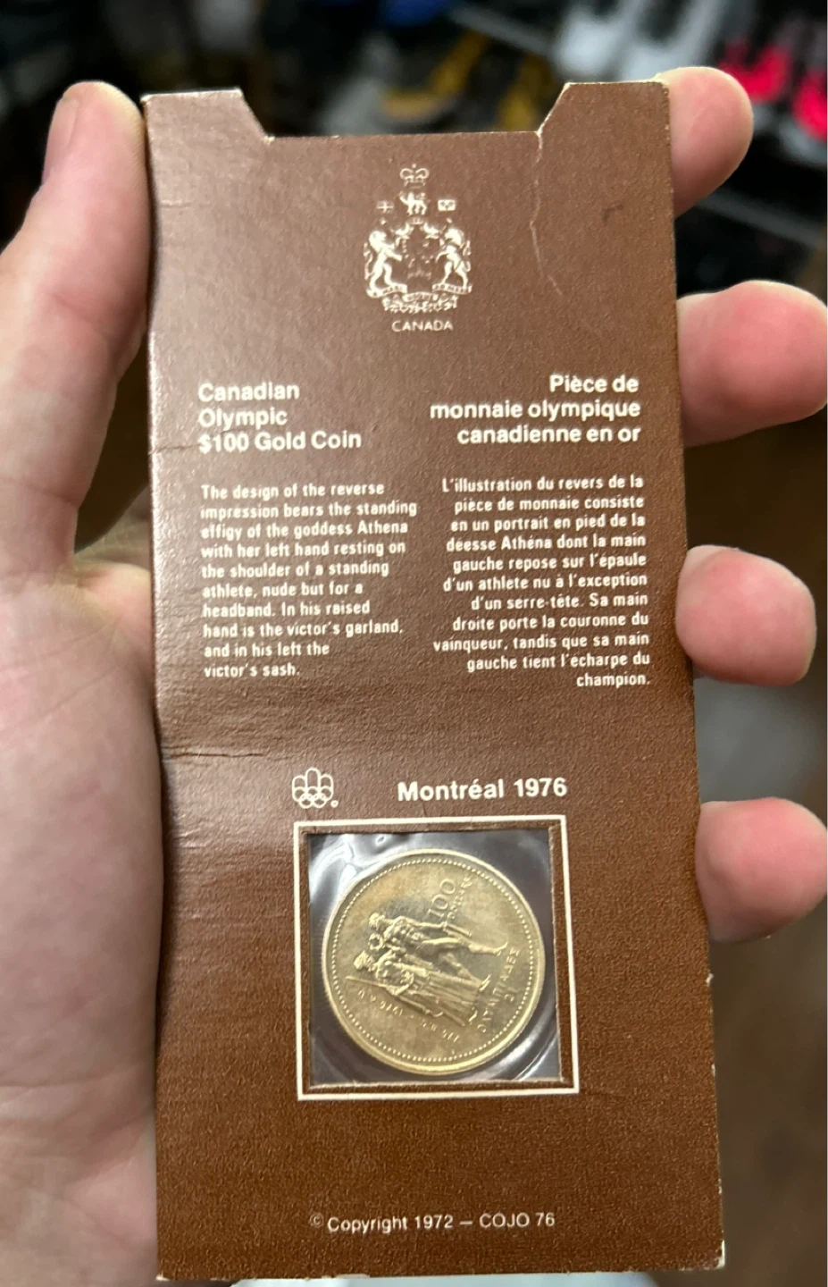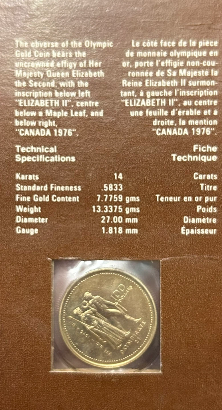 Selling two Canadian Olympic $100 Gold Coin from the Montreal 1976 Olympics. Technical Specifications: - Karats: 14 - Standard Fineness: .5833 - Fine Gold Content: 7.7759 gms - Weight: 13.3375 gms - Diameter: 27.00 mm - Gauge: 1.818 mm - Buy both for $2900 or buy individually for $1500.