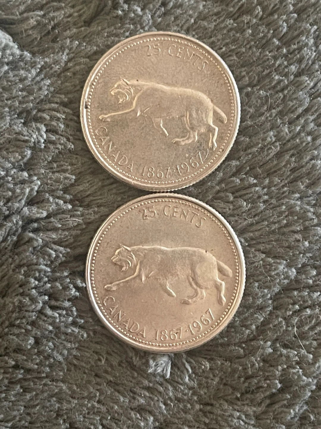 15Selling two silver Canadian 25 cent coins from 1967. They both feature a cougar design. Great for collectors!