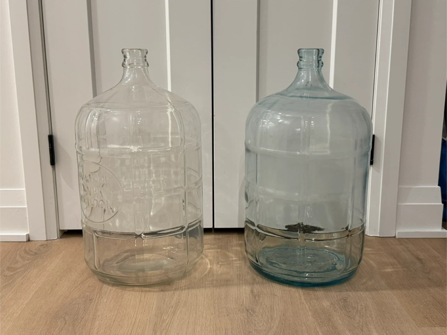 Selling two large 5-gallon glass jugs (also known as carboys). These are perfect for water storage, home brewing, fermentation, or even as decorative pieces. • Heavy-duty, thick glass construction • One is clear, the other has a subtle blue tint • Both in excellent condition – no cracks or chips • Great for brewing, wine-making, or as vintage-style water dispensers