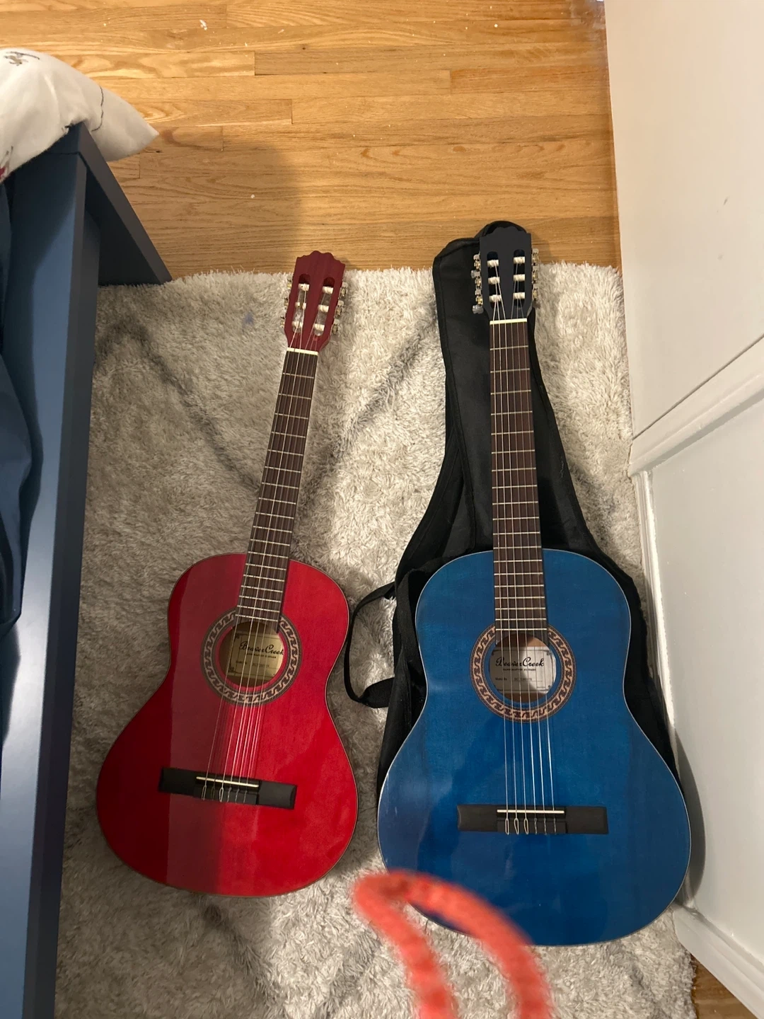 Selling two acoustic guitars, one in red and one in blue. Both are in good condition and ready for a new home. Perfect for beginners or anyone looking to add to their collection!