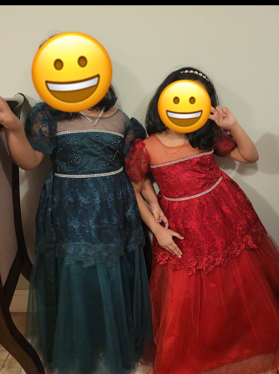 10Two beautiful girls' dresses. Teal and red floor-length gowns. Lace detailing and beaded accents. Short sleeves. Sheer yoke. Both 35- 40$