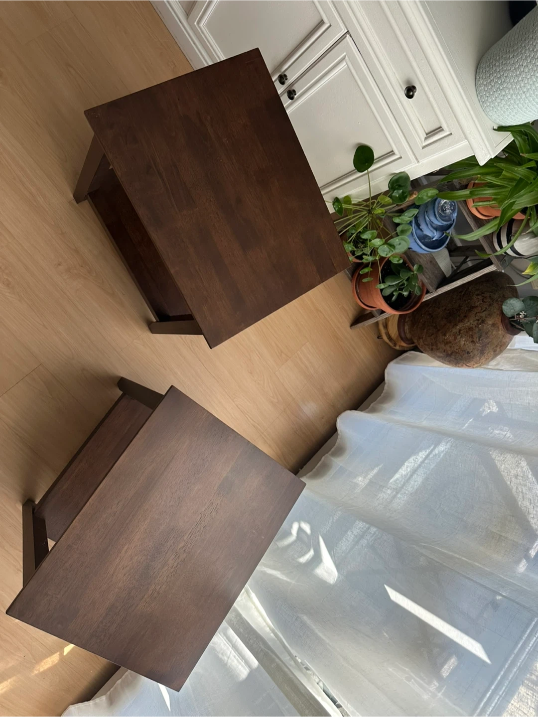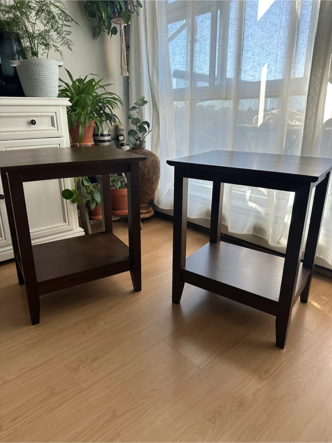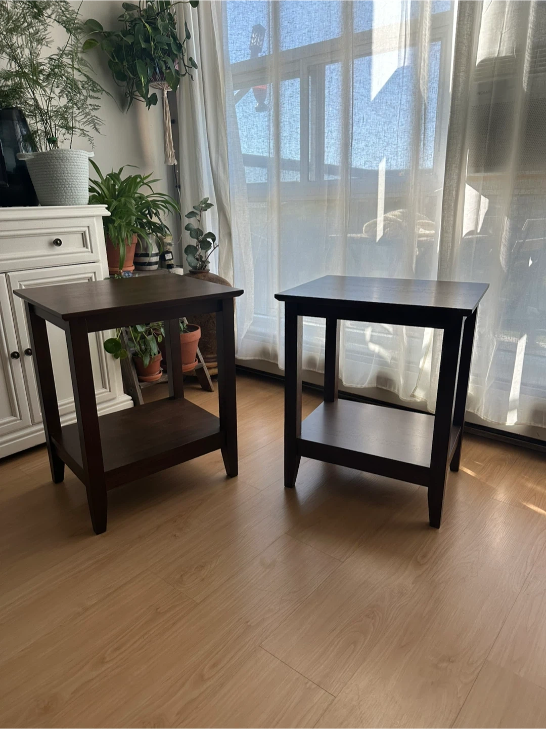 45 $ each both for 90 $ Selling a pair of sturdy brown wooden nightstands. They're in great shape and would look lovely in any bedroom or living space! Perfect for holding lamps, books, or your favourite decor items. Come grab them today