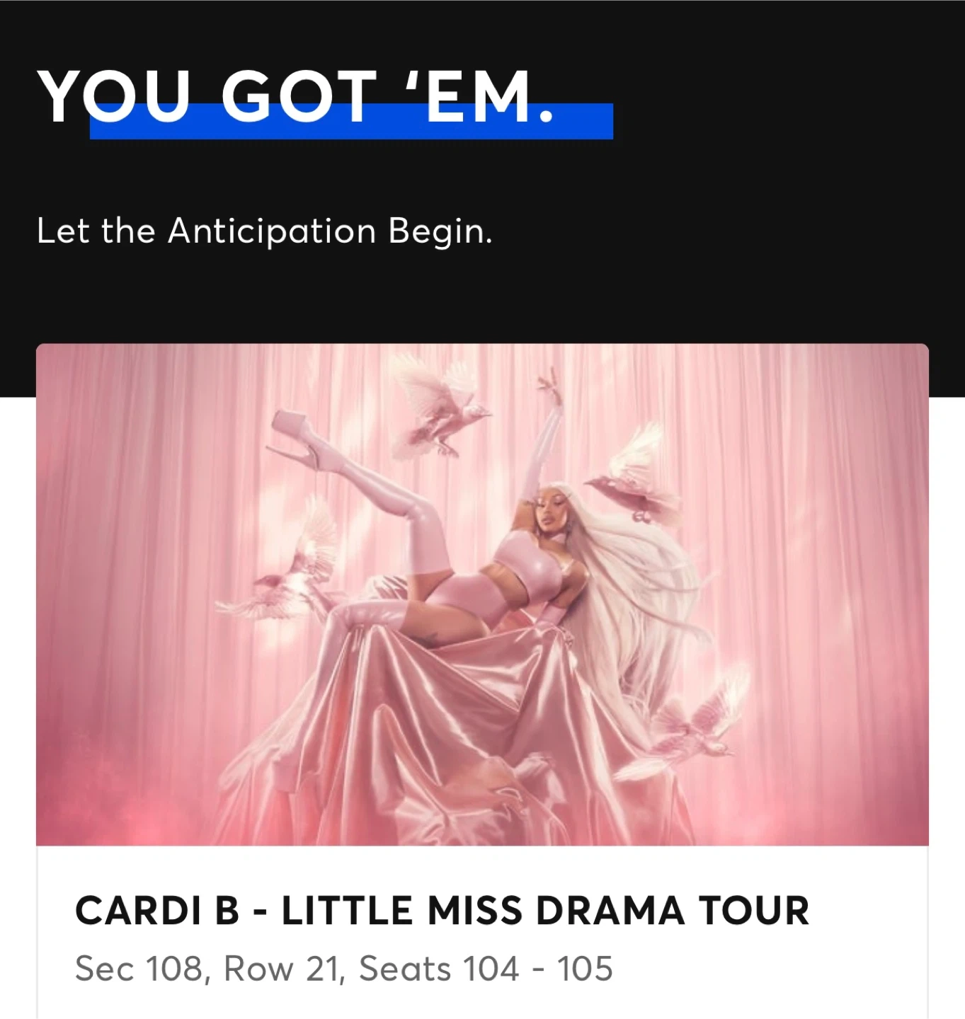 162 tickets great seats sat together for cardi B in Vancouver Feb 21st 2026 Selling because I’m going to be out of town at the time of the concert.