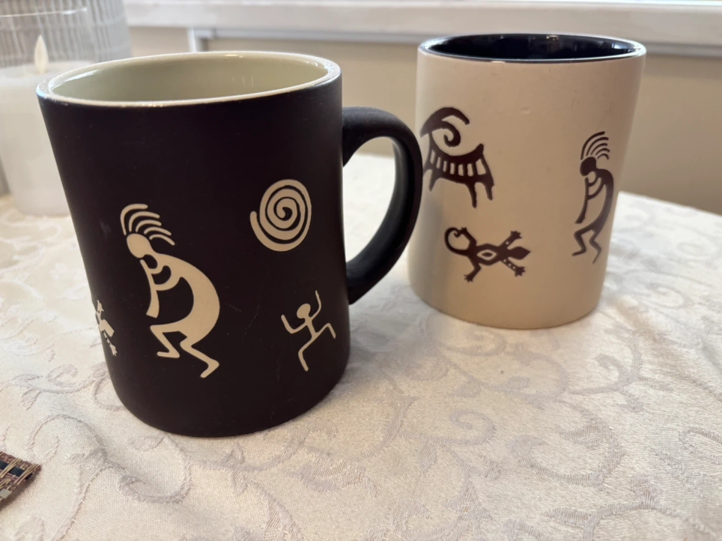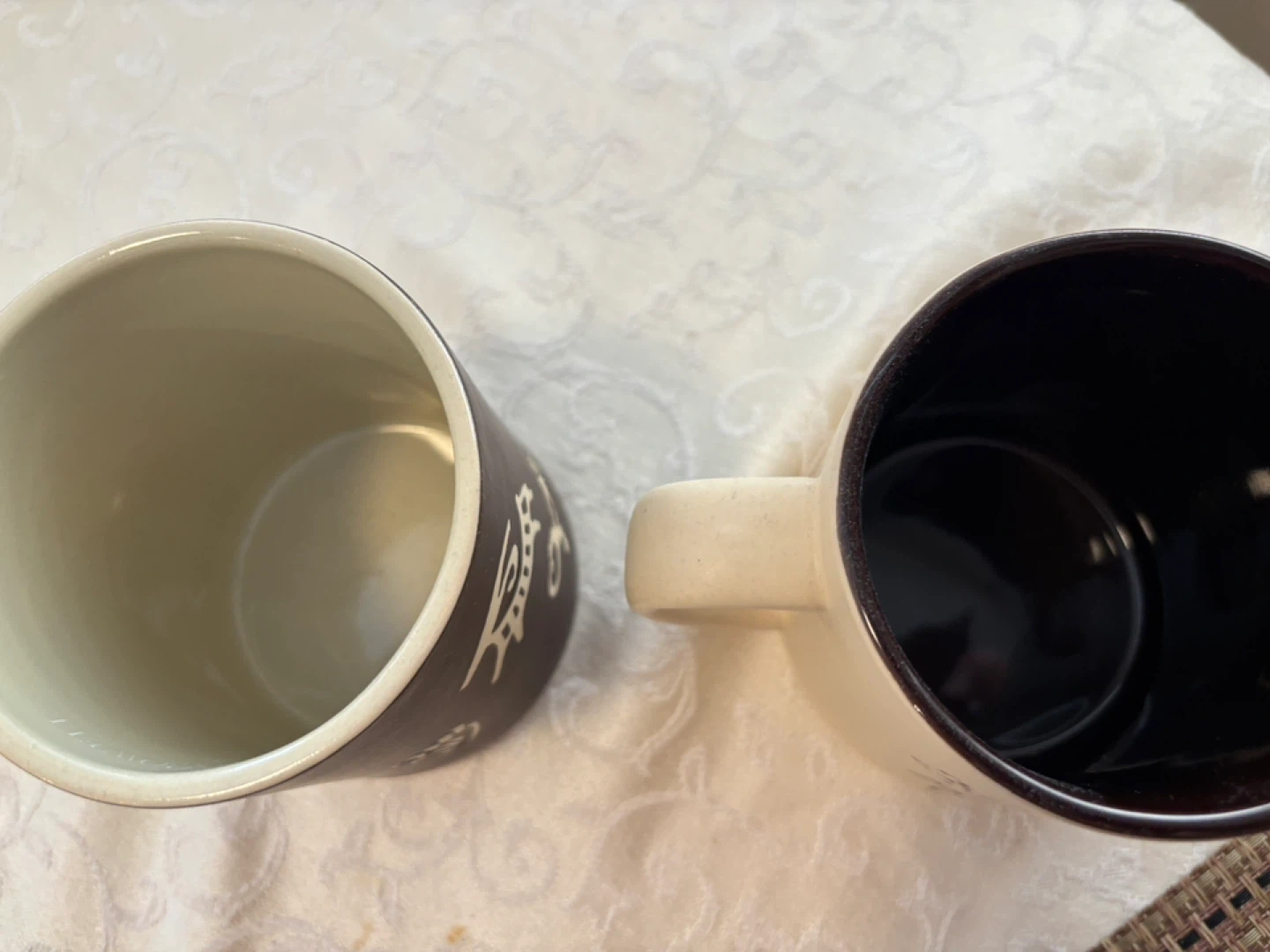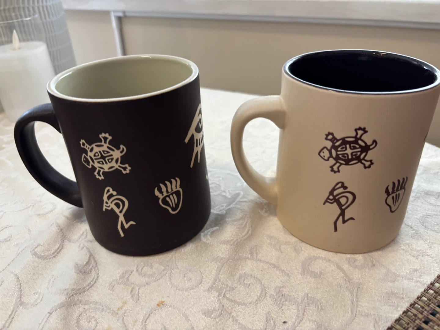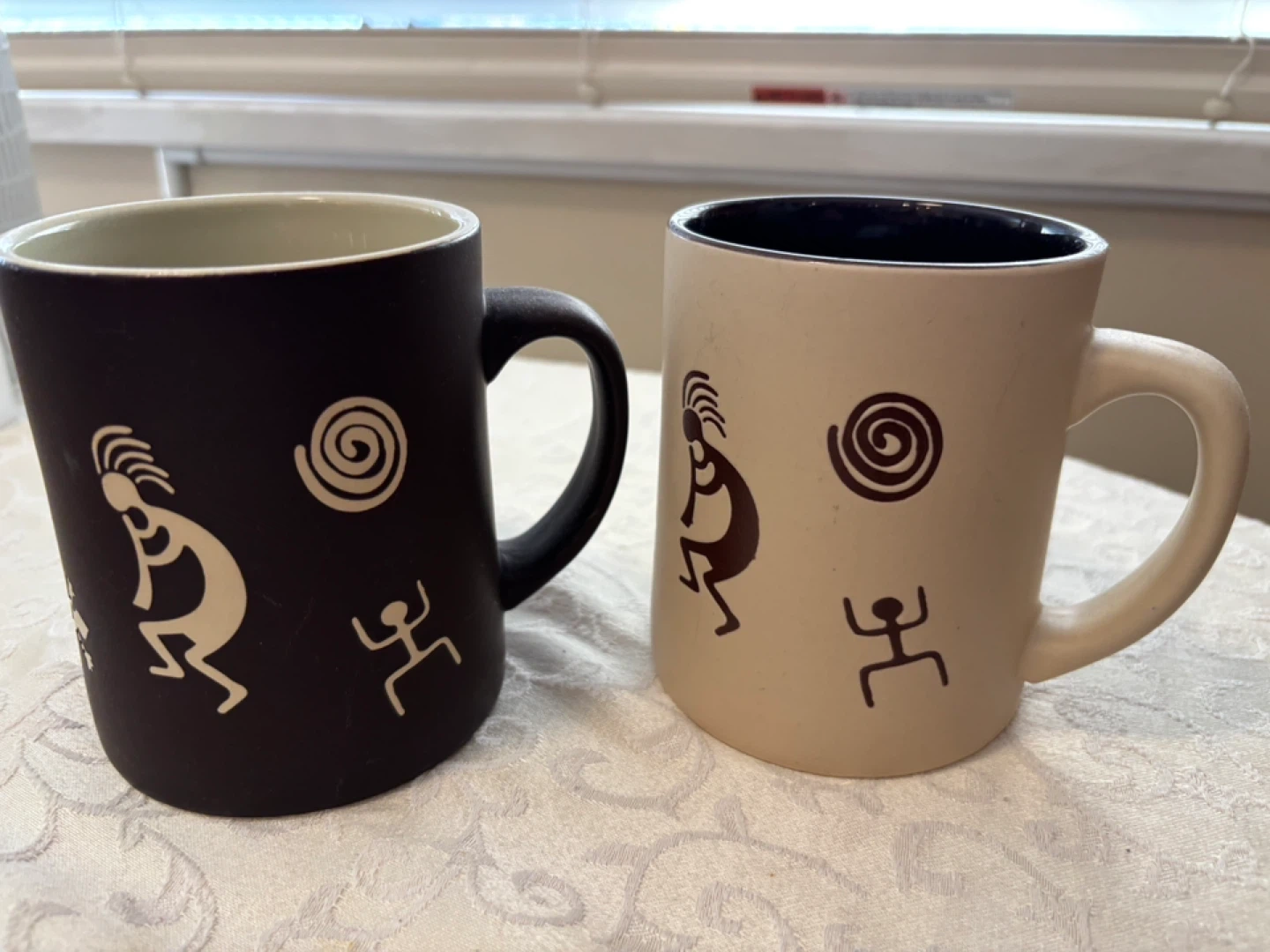25Two coffee mugs with decorative designs. One is black with light beige interior and the other is beige with a dark brown interior. They feature decorative symbols. Perfect for coffee or tea!