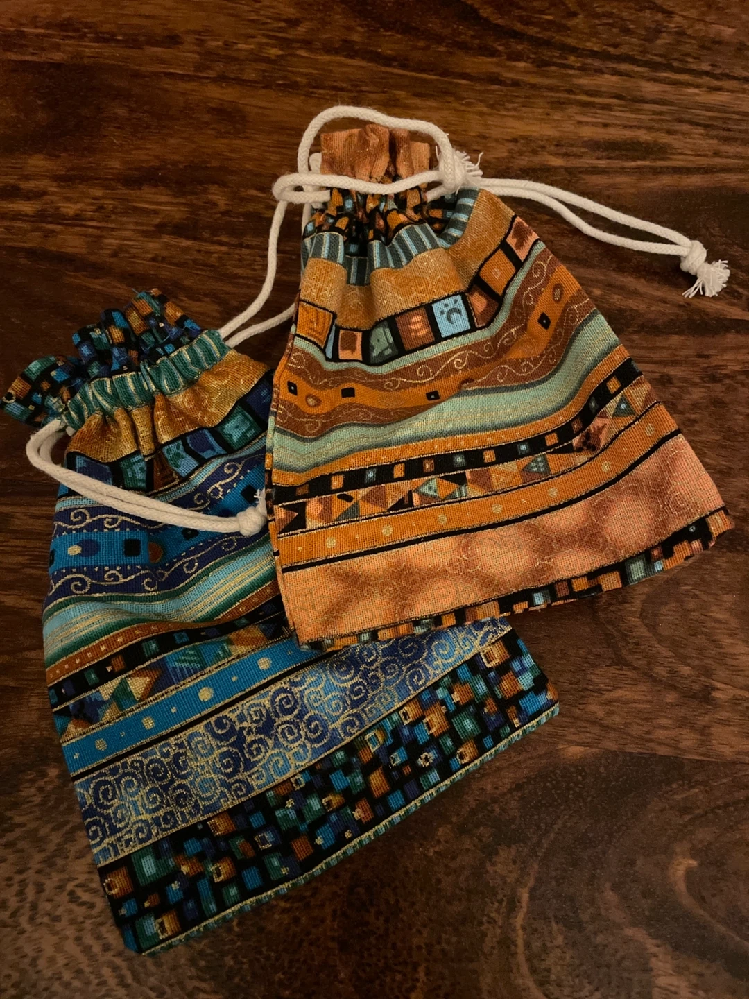 Two cute drawstring pouches! One is a blue and gold pattern, and the other is orange and brown. Perfect for small items or gifts!