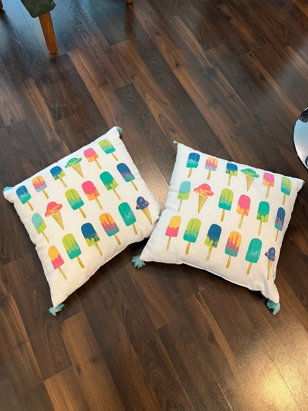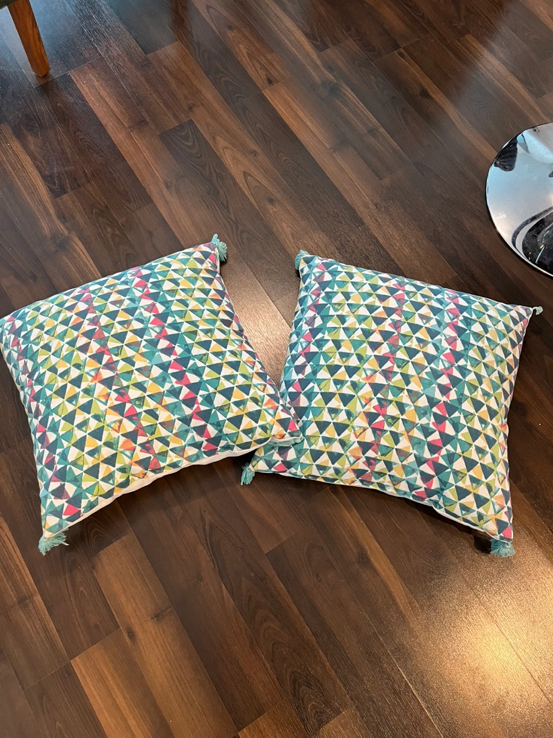 Pair of square throw pillows. Geometric and ice cream cone prints. Light coloured cotton fabric. Teal tassels on each corner. Perfect for adding a pop of colour to your living room or bedroom.