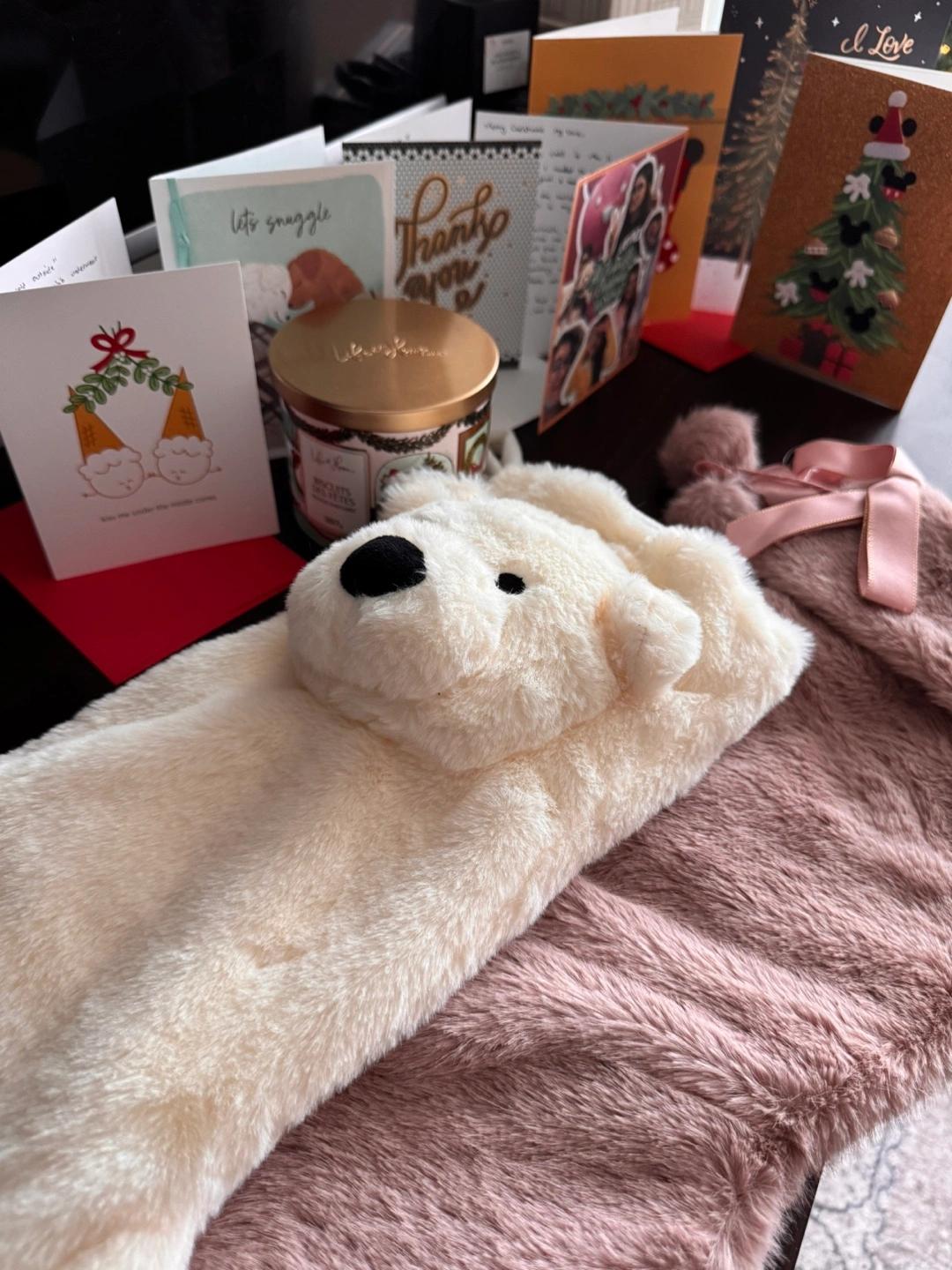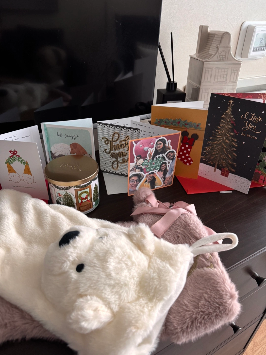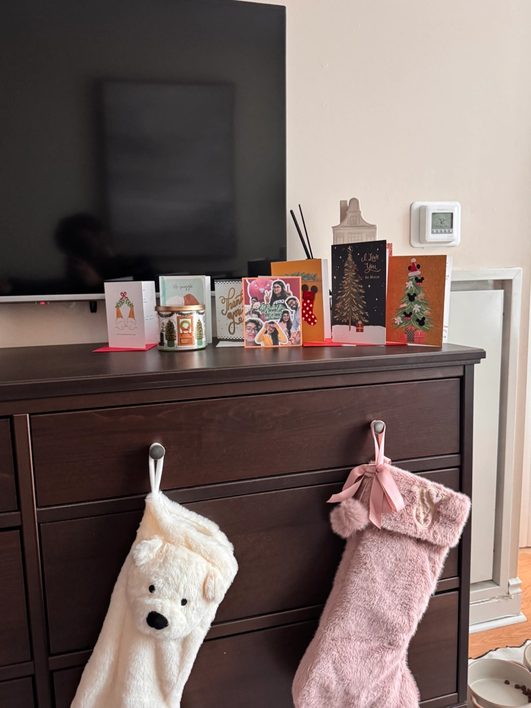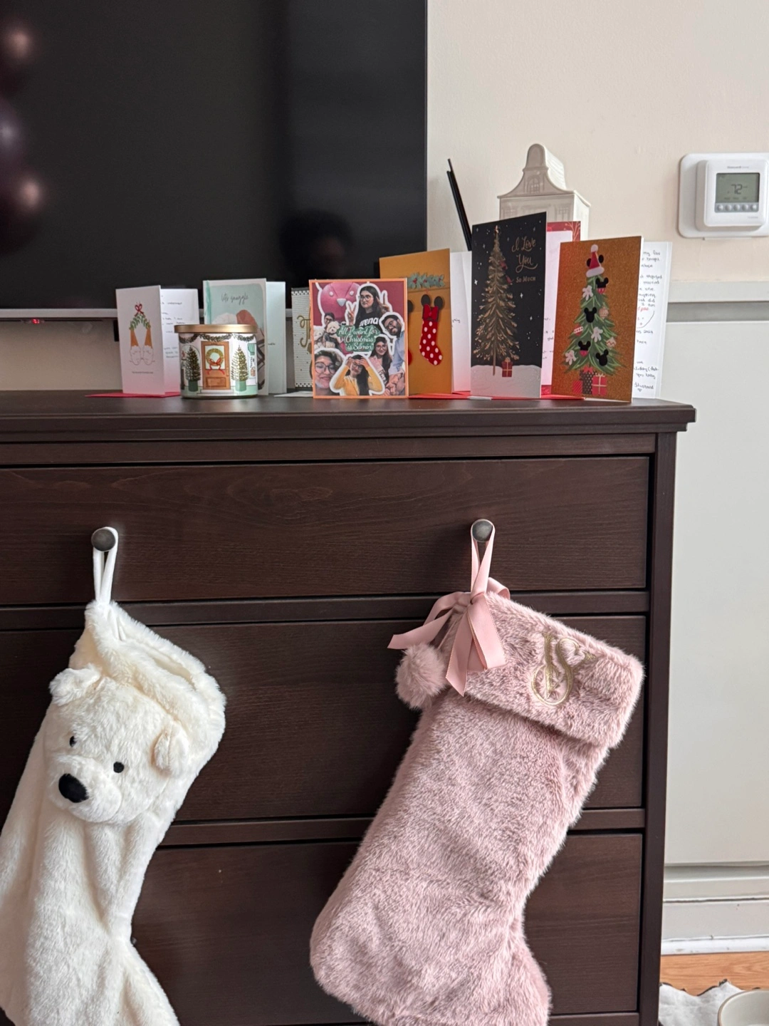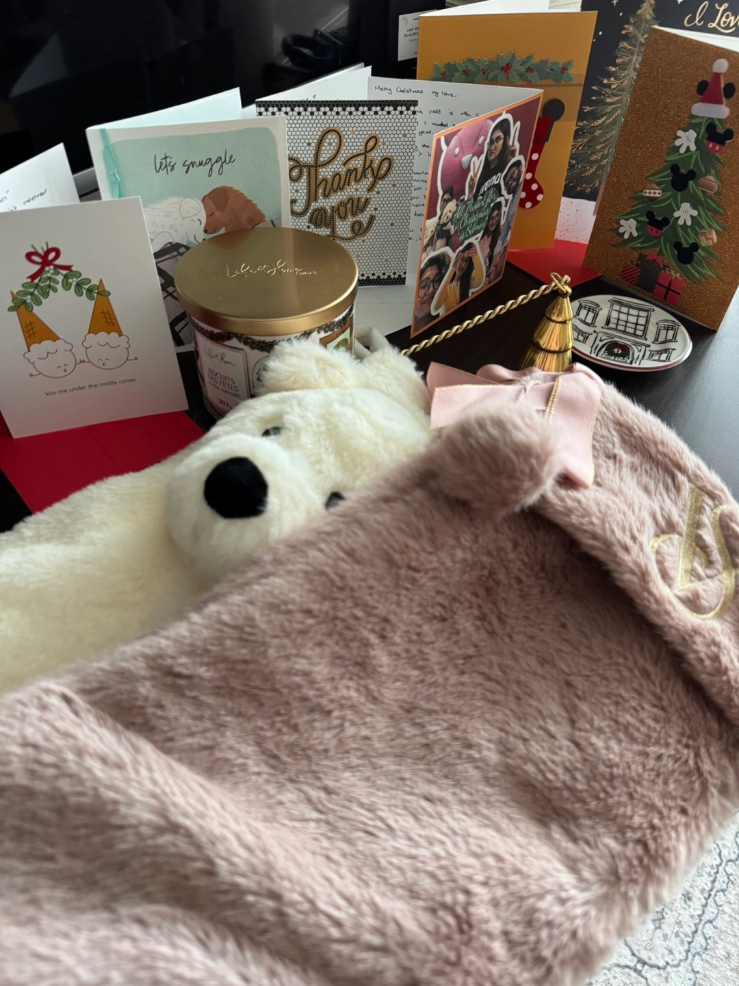 Pair of plush Christmas stockings. One features a polar bear face. Pink stocking has a ribbon and monogram. Perfect for holiday decor. Brand new, comes with tag