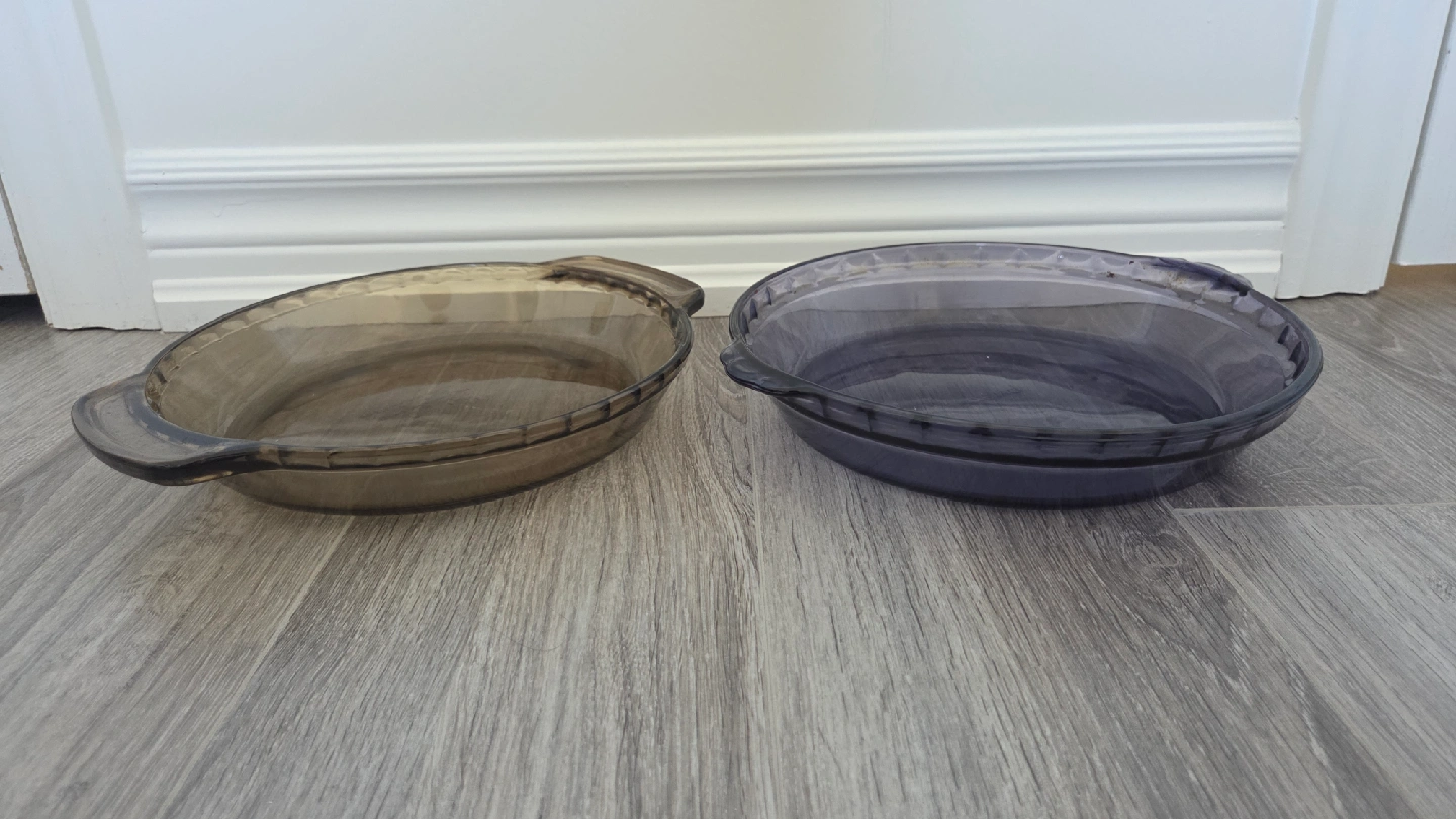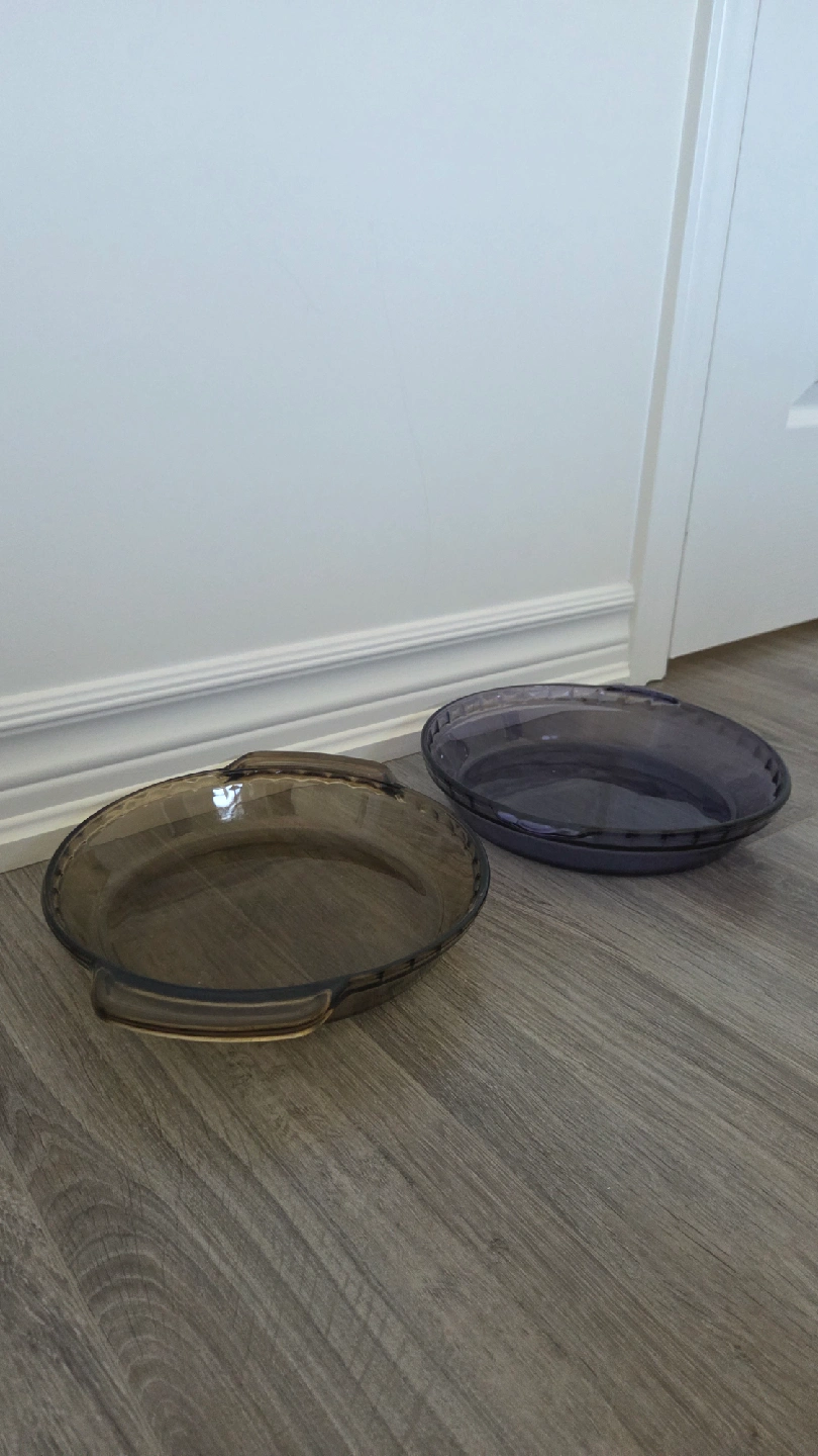 10Selling two glass baking dishes. They are in good condition and ready for your next baking project! One is a light brown colour and the other is purple.