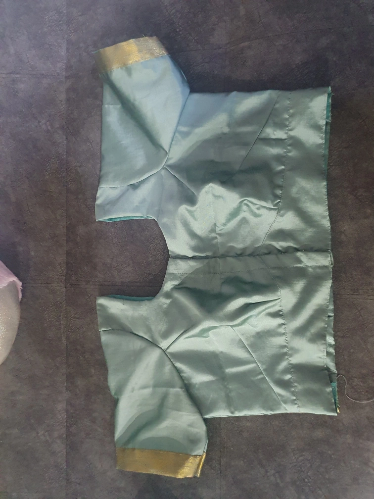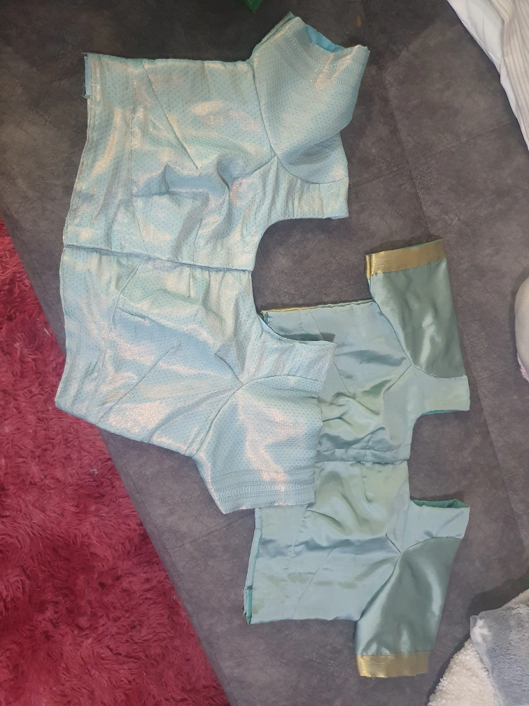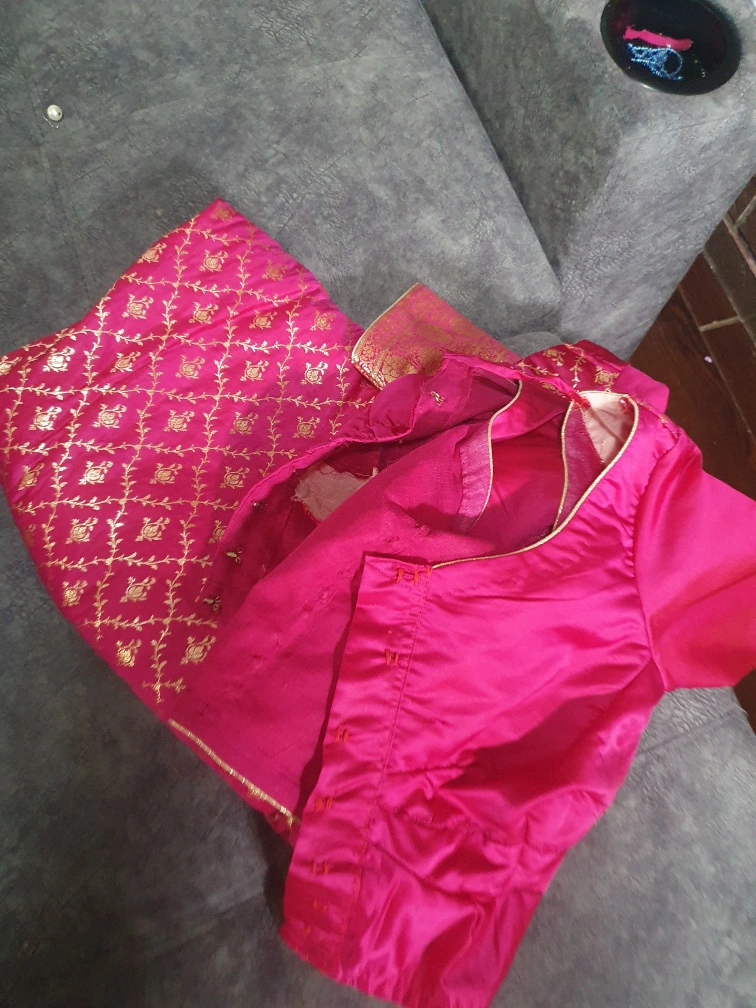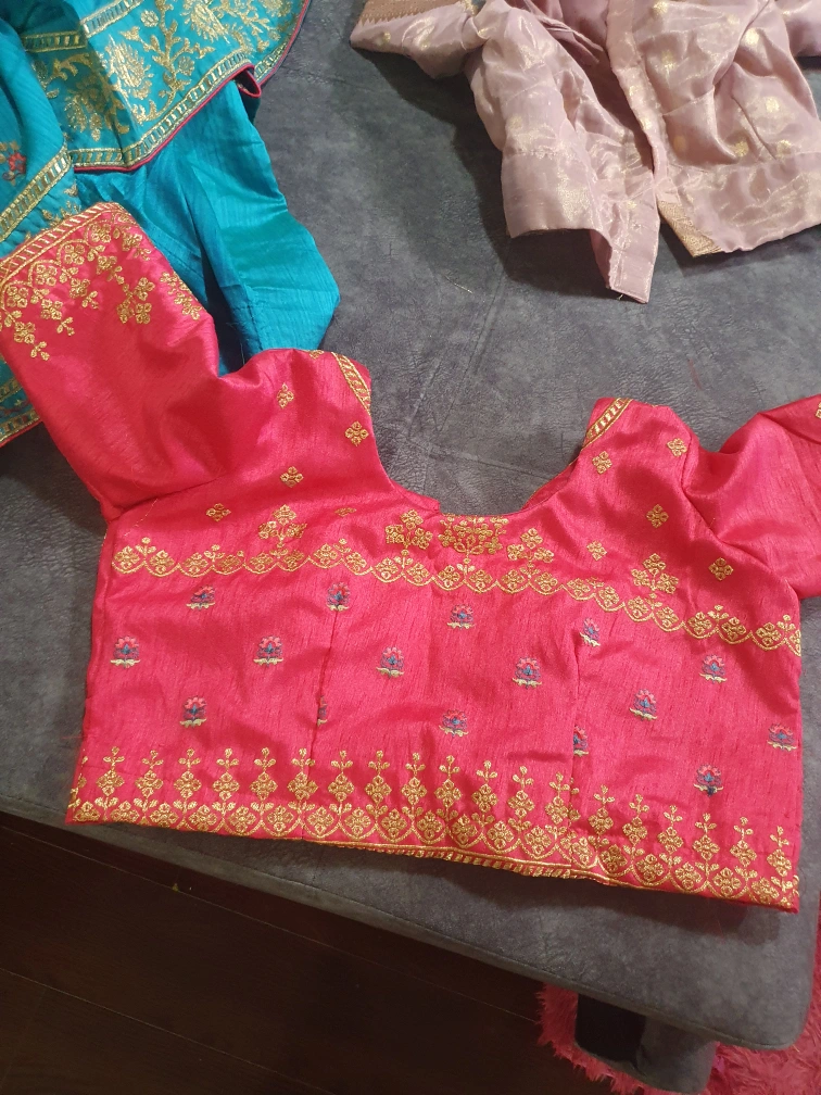 10Two Indian blouses, one pink with gold embroidery and one teal. Both are sleeveless and have a round neckline.