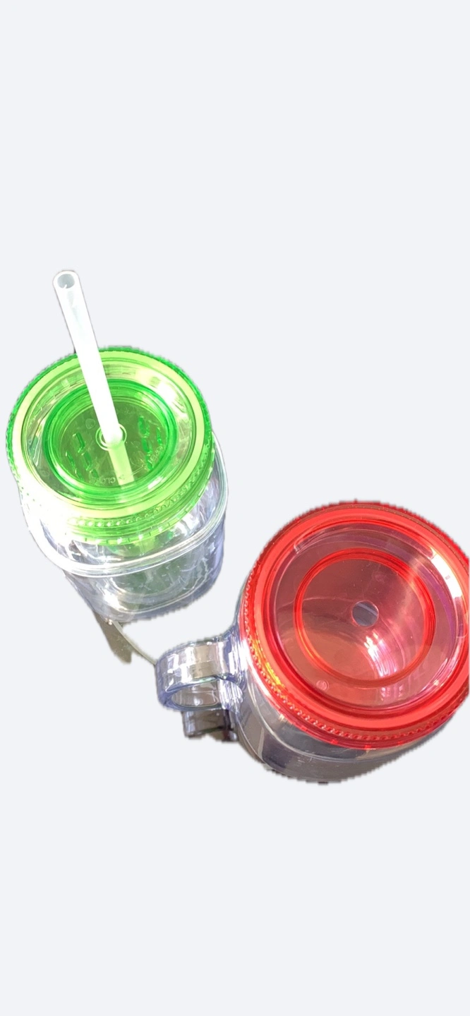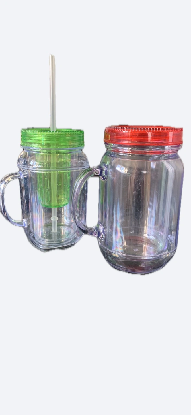 120Set of two clear plastic mason jar tumblers. Each features a handle and a colourful lid. Green lid has straw and infuser. Great for summer beverages.