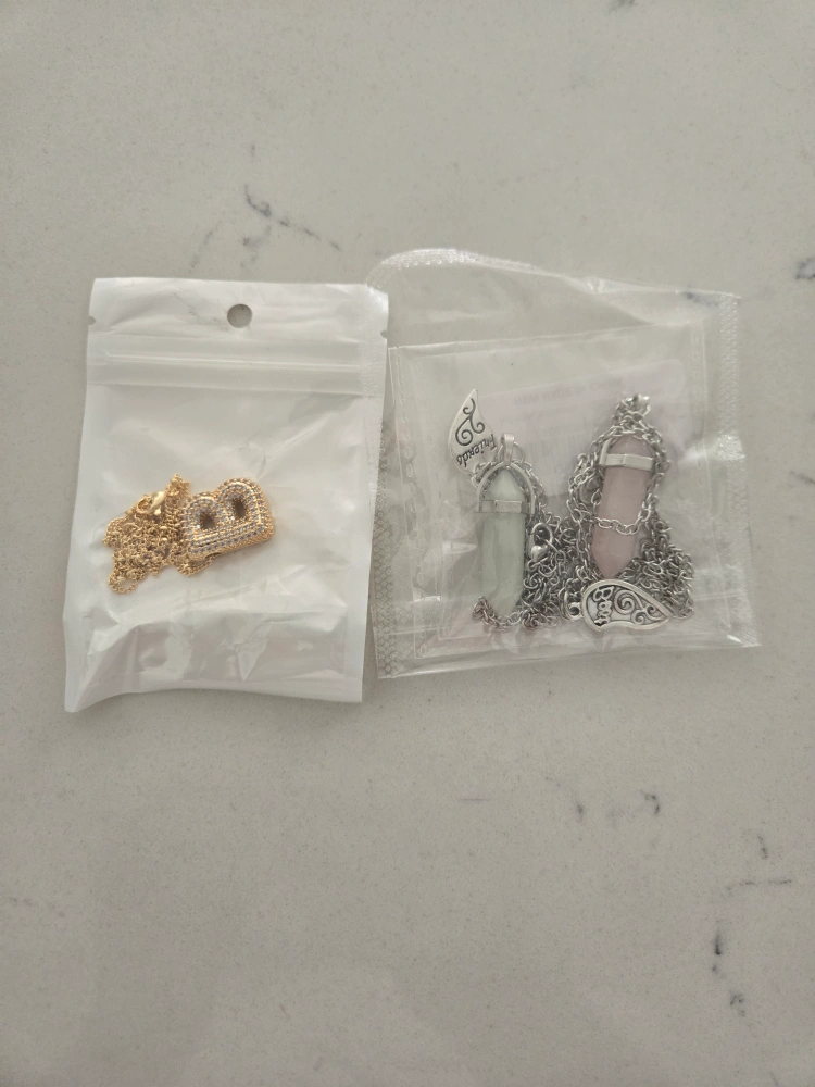 I'm selling a set of necklaces, including two crystal necklaces and a gold-tone 'B' initial necklace. They are all in great condition!