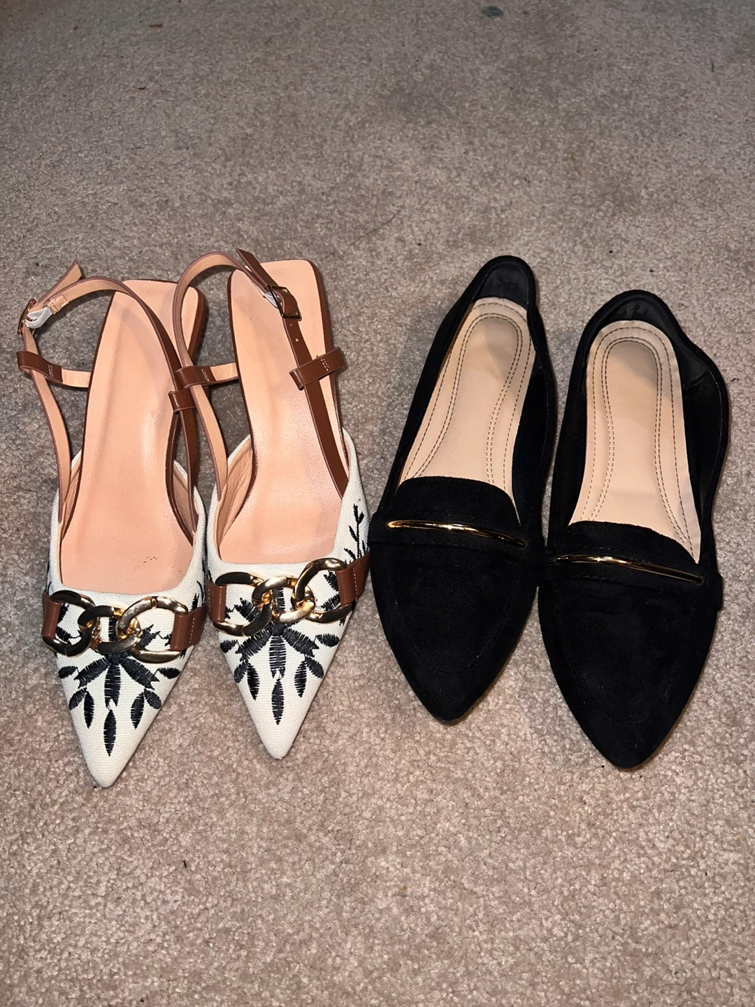 65Selling two pairs of ladies' shoes. One pair is white with black floral embroidery and a brown ankle strap. The other pair is black with a gold accent.