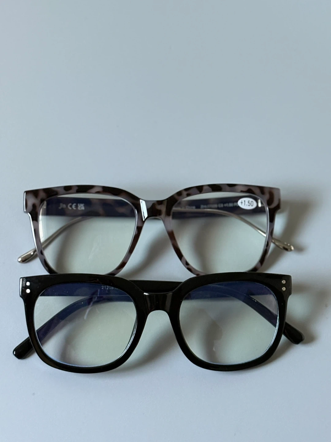 Selling two pairs of magnifying/ blue light blocking reading glasses. One is black and the other is a brown/grey pattern. Both pairs have a +1.50 magnification