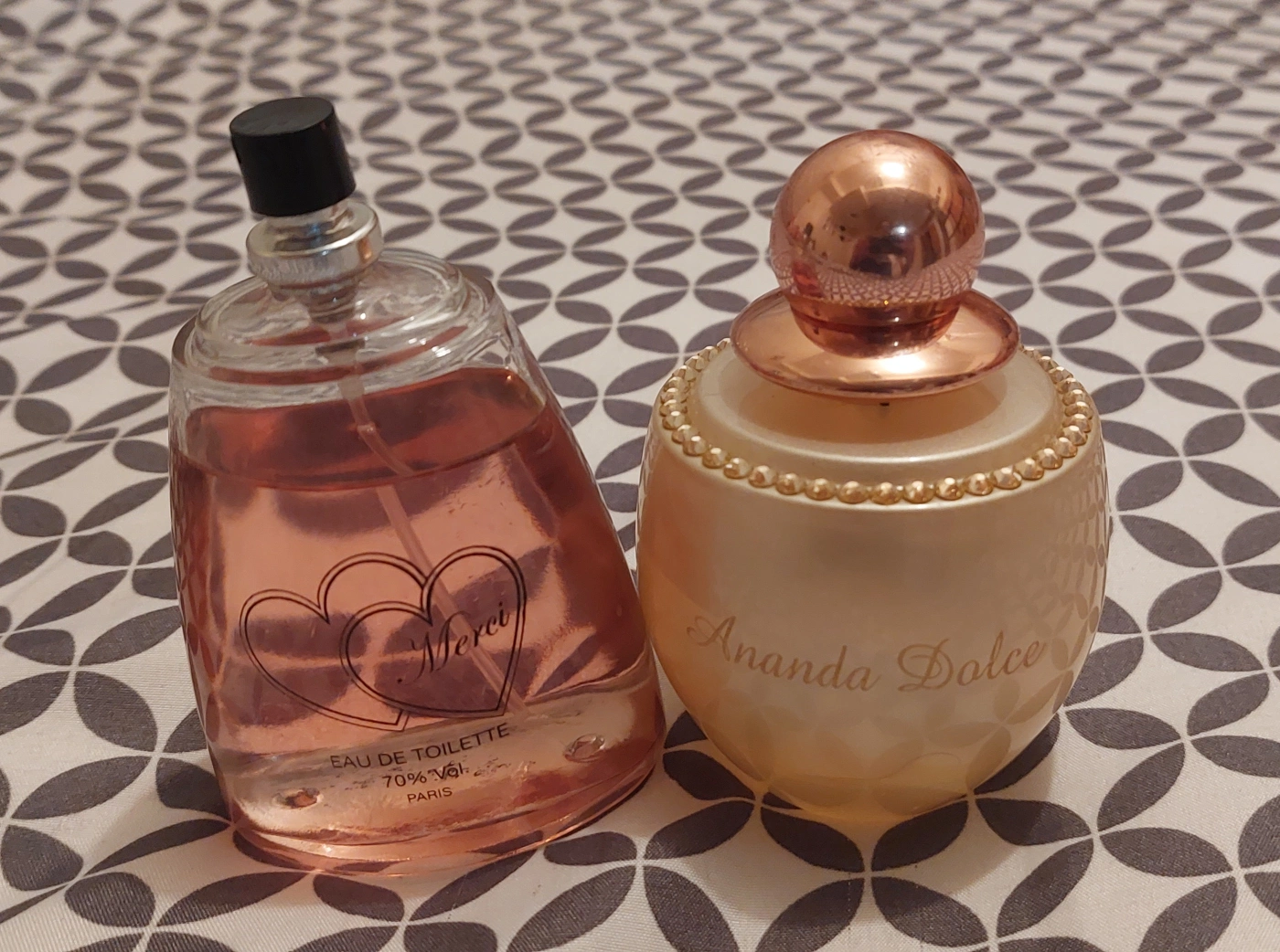 Two perfume bottles are up for grabs! One is Merci Eau de Toilette, and the other is Ananda Dolce. Both bottles are partially used, as shown in the photos. They are great for anyone who loves to collect or try new scents $10 each ,cash only thanks.