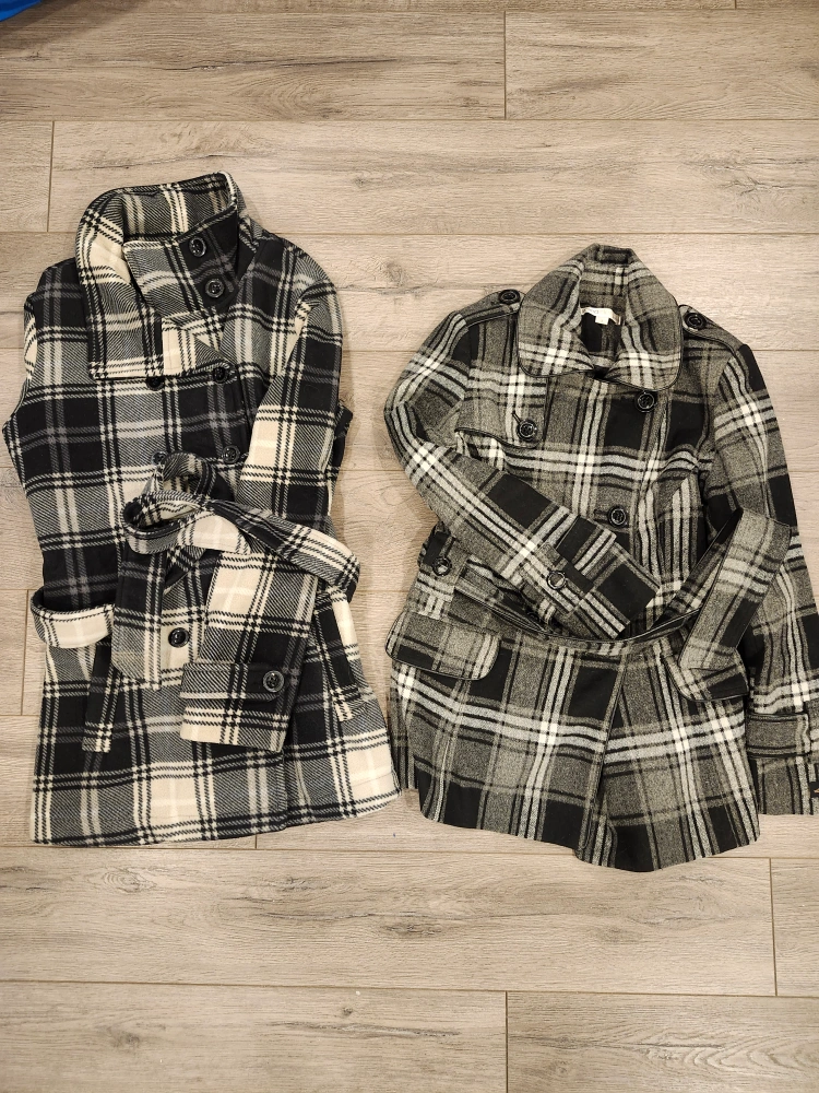 Two stylish plaid coats up for grabs! Both are in great shape and ready to keep you warm this season. One coat has a black and white plaid, and the other features a gray and white plaid. Perfect for adding a touch of classic style to your wardrobe