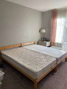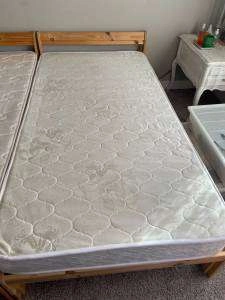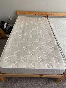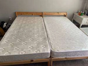 20Two single beds - pine wood frame and spring matress. The natural solid wood frame and the bed frame is high enough so you can place storage boxes underneath.