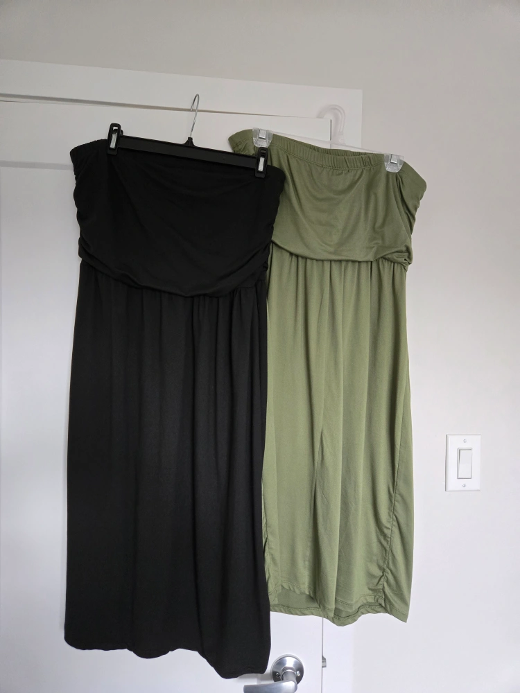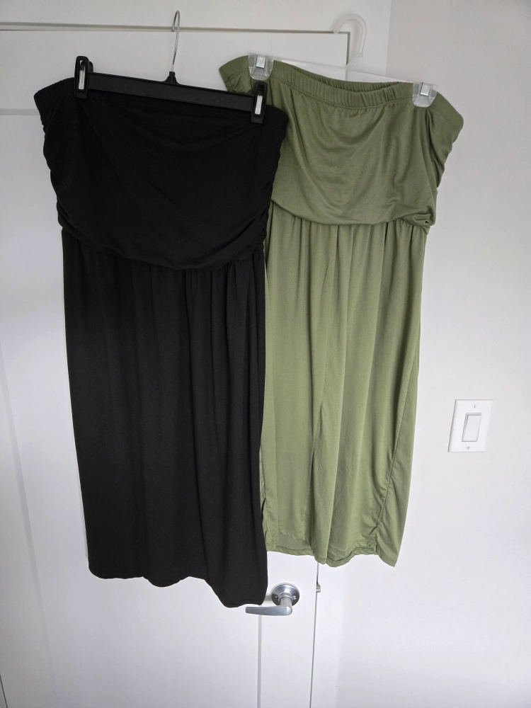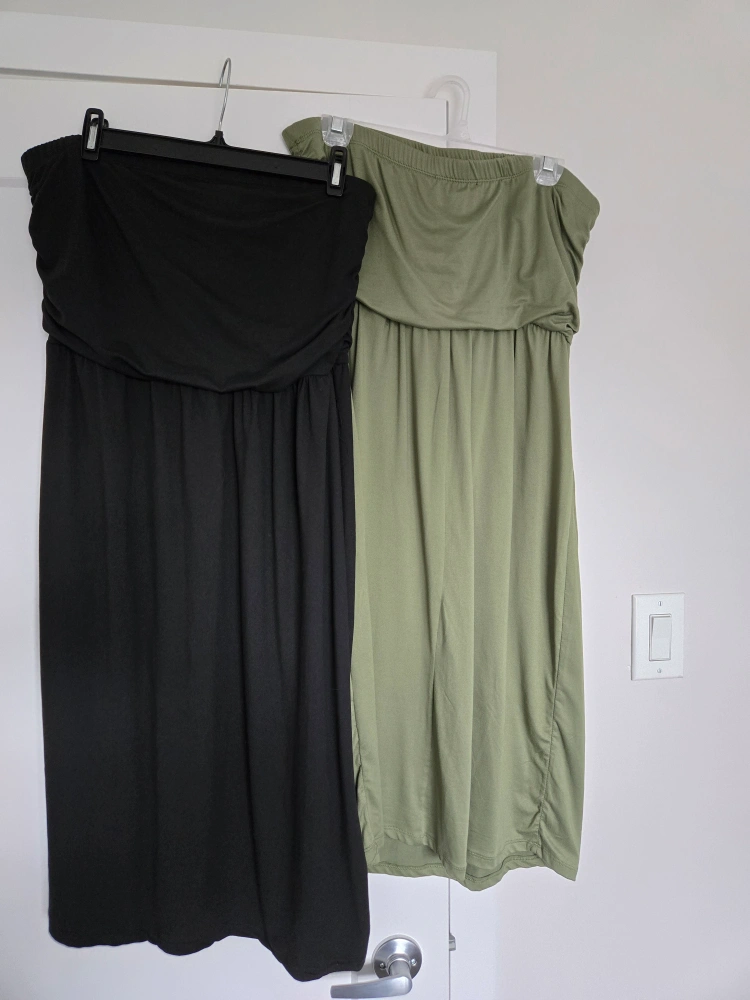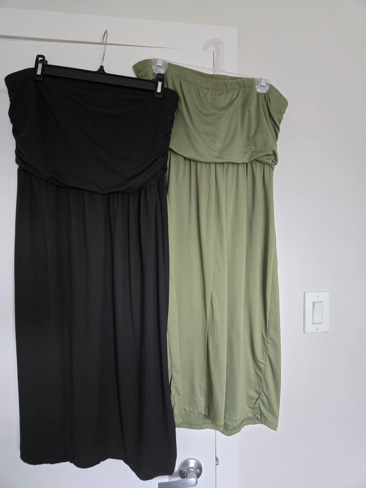 10Selling two gently used strapless dresses. One is black and the other is olive green. Both are in great condition and perfect for summer! Both are size LARGE Asking $5.00 for each dress