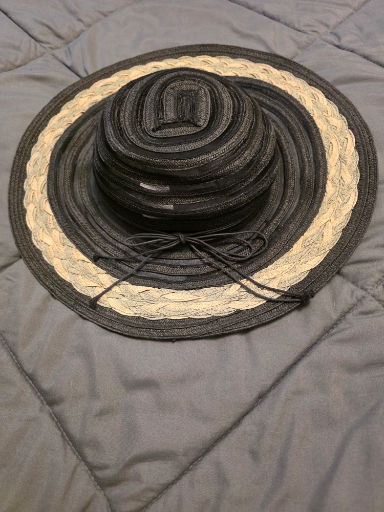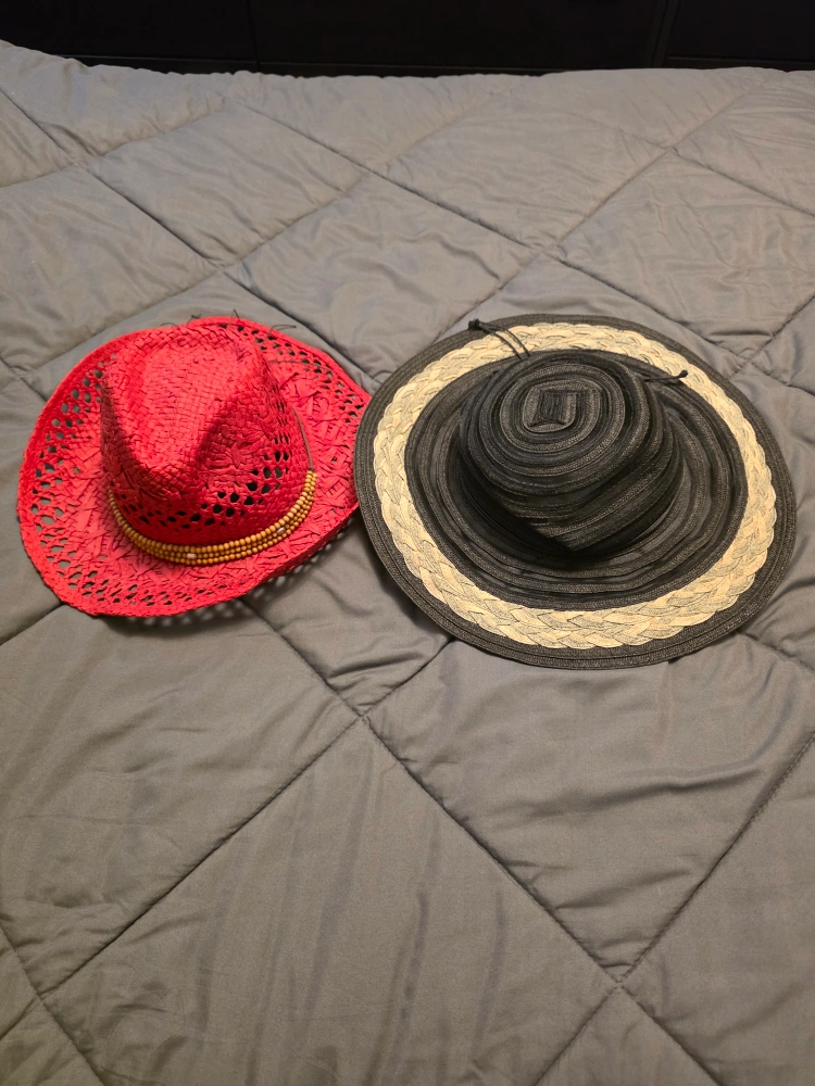 Selling two hats together! One is black with a beige trim, made of 60% paper and 40% polyester. The other is a vibrant red and made of 100% paper