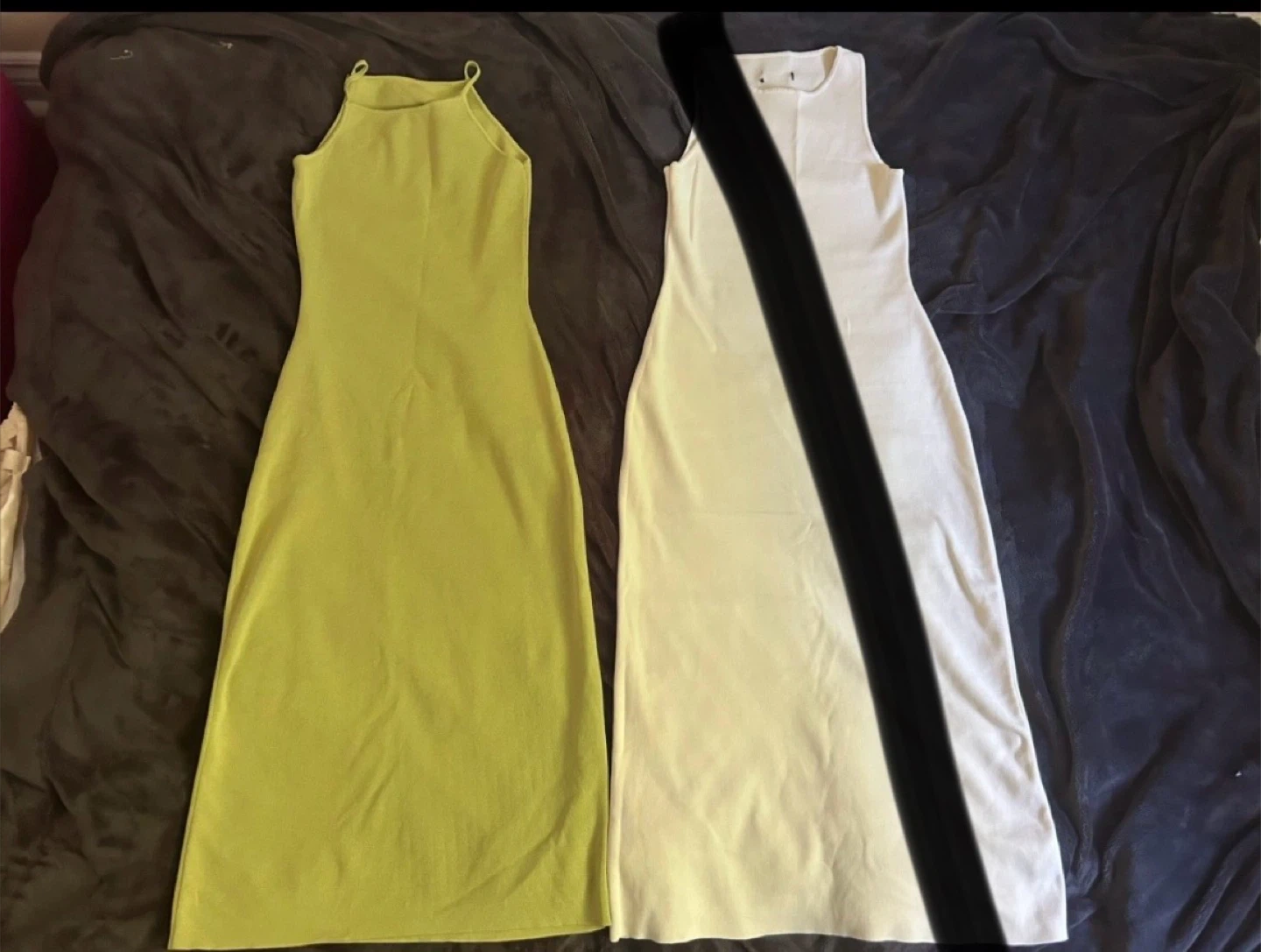 10Selling two sundresses together! One is a vibrant green, and the other is a simple white. Green size S