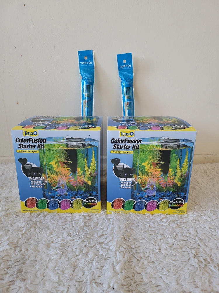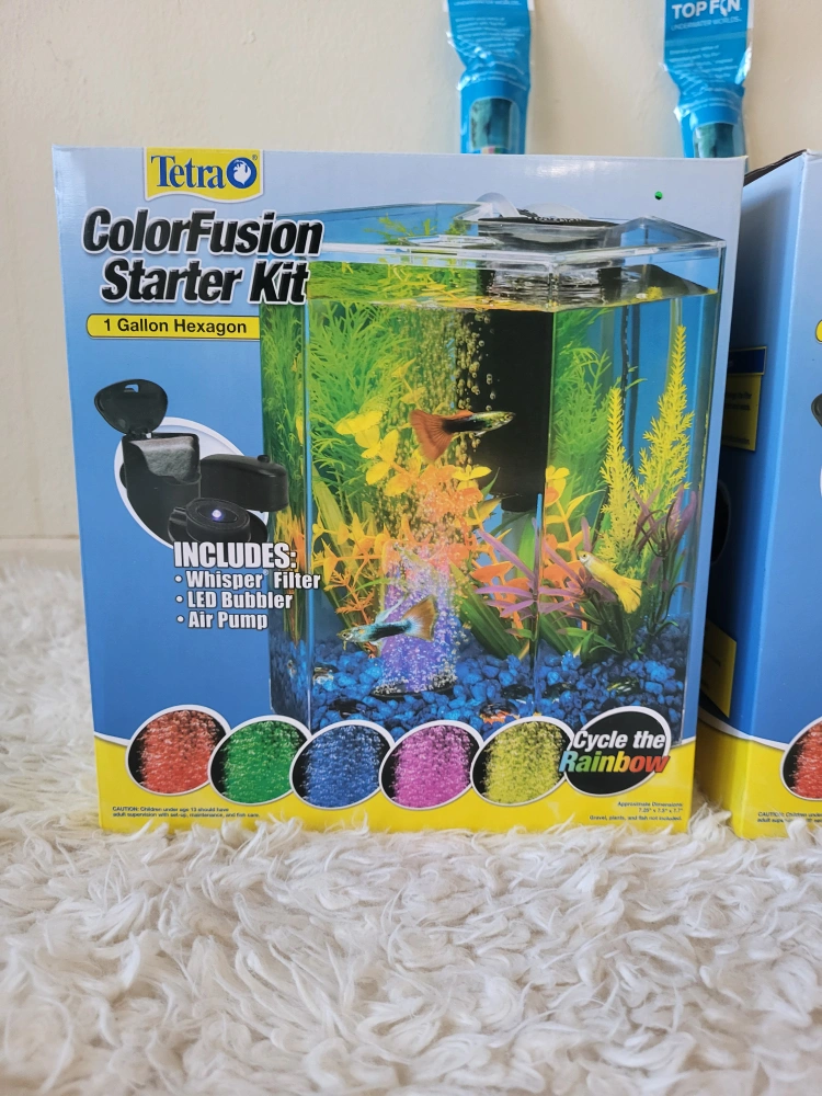74Two brand new, unopened Tetra ColorFusion 1 Gallon Hexagon Starter Kits. Each kit includes a whisper filter, LED bubbler, and air pump. Cycle the Rainbow coloured gravel included.