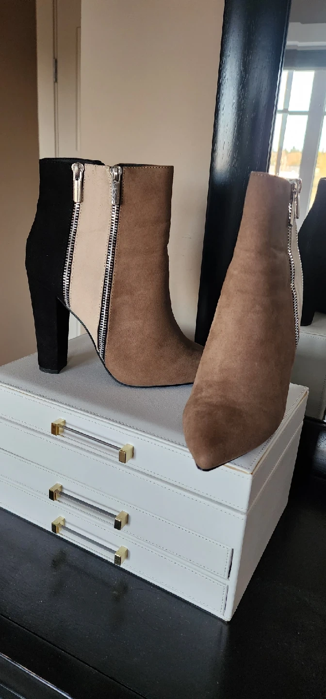 15Stylish two-tone ankle boots with a comfortable heel. These boots feature a unique colour block design with black, beige, and brown tones, complemented by a silver zipper detail. Perfect for adding a touch of flair to any outfit!