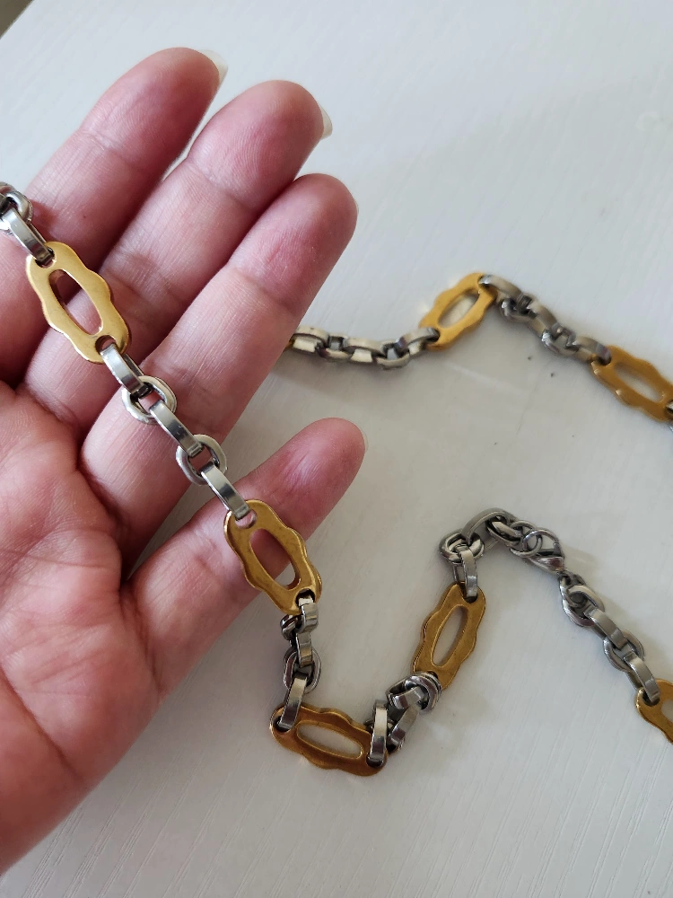 Selling a stylish two-tone chain necklace! It features a mix of silver and gold-coloured links in an alternating pattern. It's in great condition and would make a lovely addition to any outfit