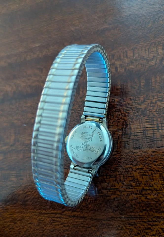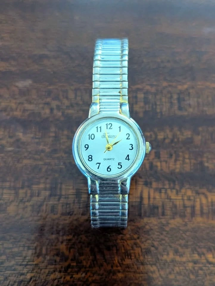 Two-tone silver and gold-colored watch with expansion band. The watch features a white dial with easy-to-read numbers and a quartz movement. This timeless piece is in excellent pre-owned condition and keeps accurate time. Perfect for everyday wear or as a stylish accessory. Condition: Used - Excellent Condition. Needs a new battery.