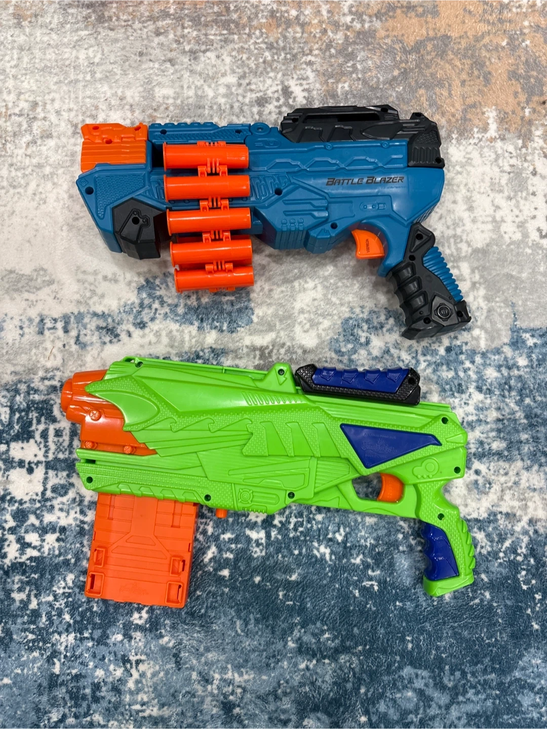 10Two toy guns for sale! One is a blue Battle Blazer with orange accents, and the other is green with orange and blue details. Ready for some fun!