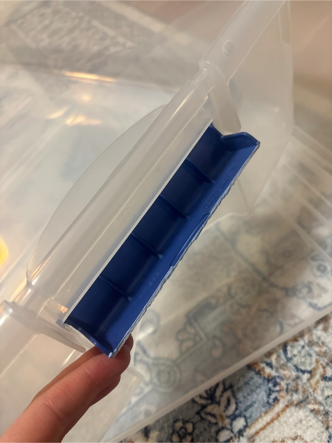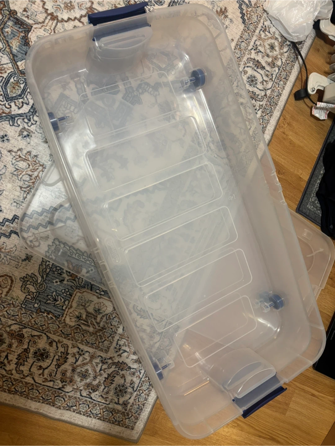 1000+Selling two under bed Sterilite 66 Qt storage boxes with lids. They have wheels. In great working condition and ready to help you organize your space. One of the handles on one of the boxes is broken (see 3rd picture) but it was not a problem for me. I had clothes stored in them so they are clean from a pet free smoke free home. The dimensions are 39½" L x 20¼" W x 7" H (100.3 cm x 51.4 cm x 17.8 cm). $5 for each and $10 for both.