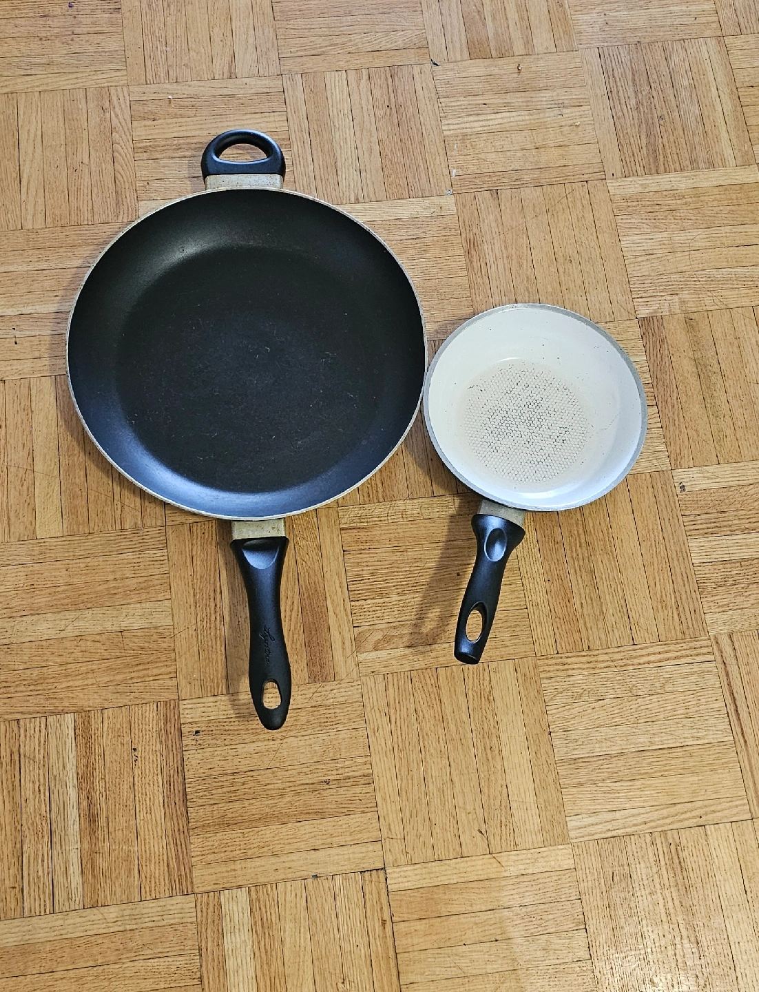 Selling two used frying pans. One is black and larger, and the other is smaller with a white interior. Both have black handles and are ready for a new home!