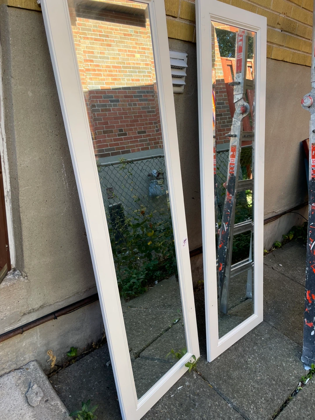 Selling two matching framed mirrors! They are in great condition and ready to brighten up your space. The frames are white, and they're perfect for adding a touch of elegance to any room. Great for a hallway, bedroom, or even a walk-in closet