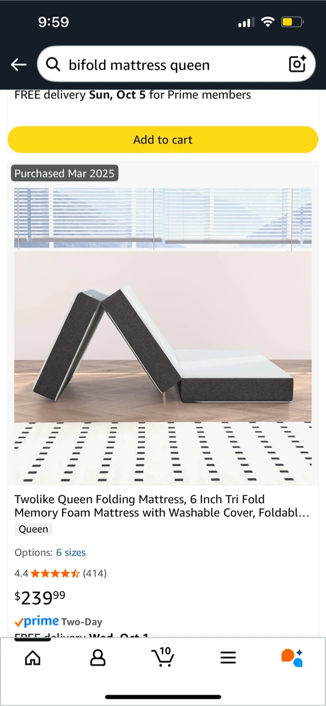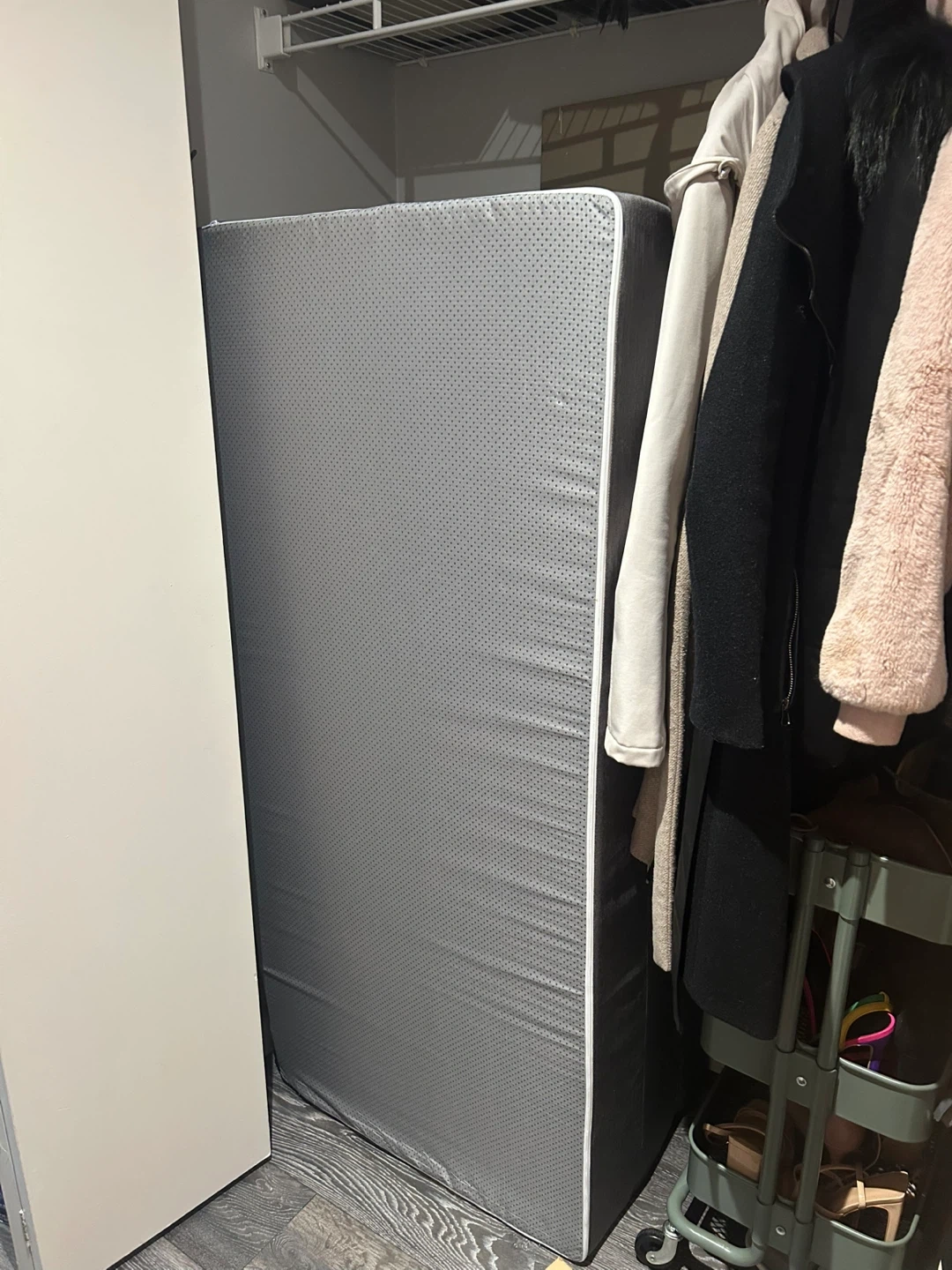 Amazon Twolike Queen Folding Mattress in excellent condition! It's a 6-inch tri-fold memory foam mattress with a washable cover. Originally purchased in March 2025 because my ENDY delivery was delayed when I moved and needed something! It fits a queen bed perfectly and I used for less than 2 weeks with a foam topper and has been in my storage since.