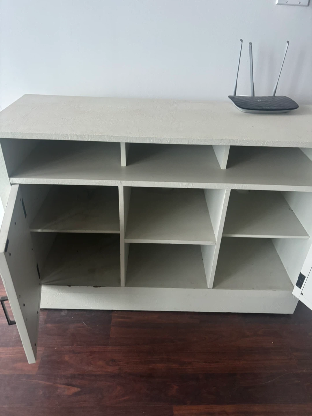 This TV stand offers ample storage with two cabinets and multiple open shelves. It's a stylish and functional piece for your living room. The distressed finish adds a touch of rustic charm. Perfect for organizing your media devices and accessories!