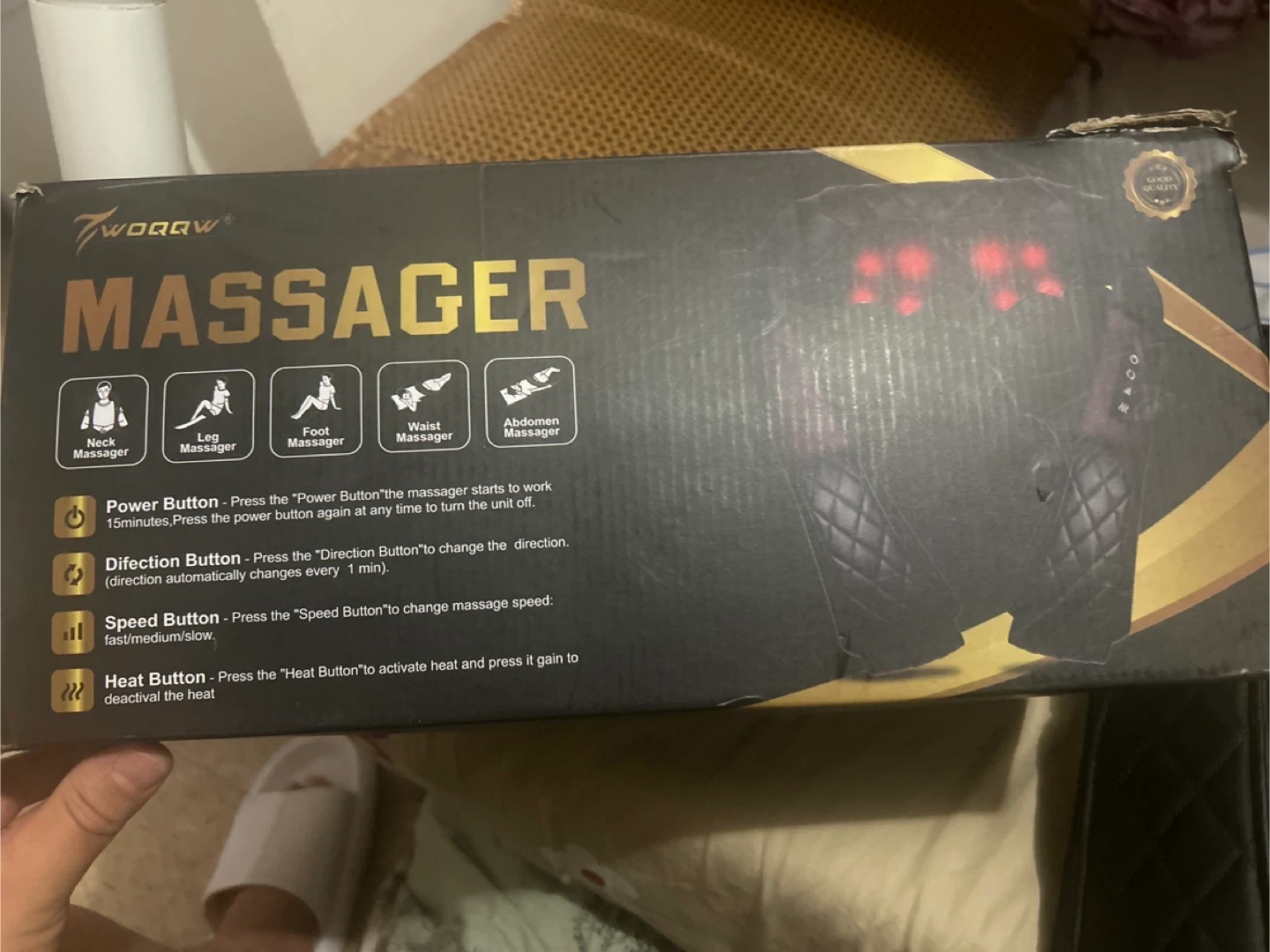 Selling a Twoqqw massager that can be used on your neck, legs, feet, waist, and abdomen! It has different buttons to control power, direction, speed, and heat, so you can customize your massage