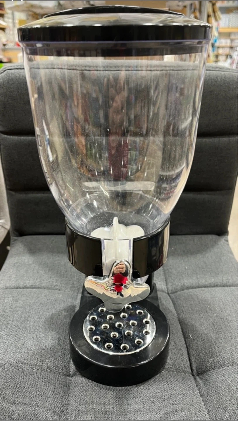 Brand new,This is a clear plastic candy dispenser with a black base and lid. It has a chrome-finished lever for dispensing. The base features small holes.