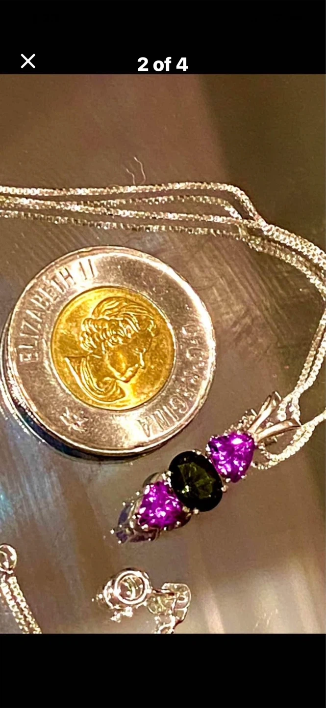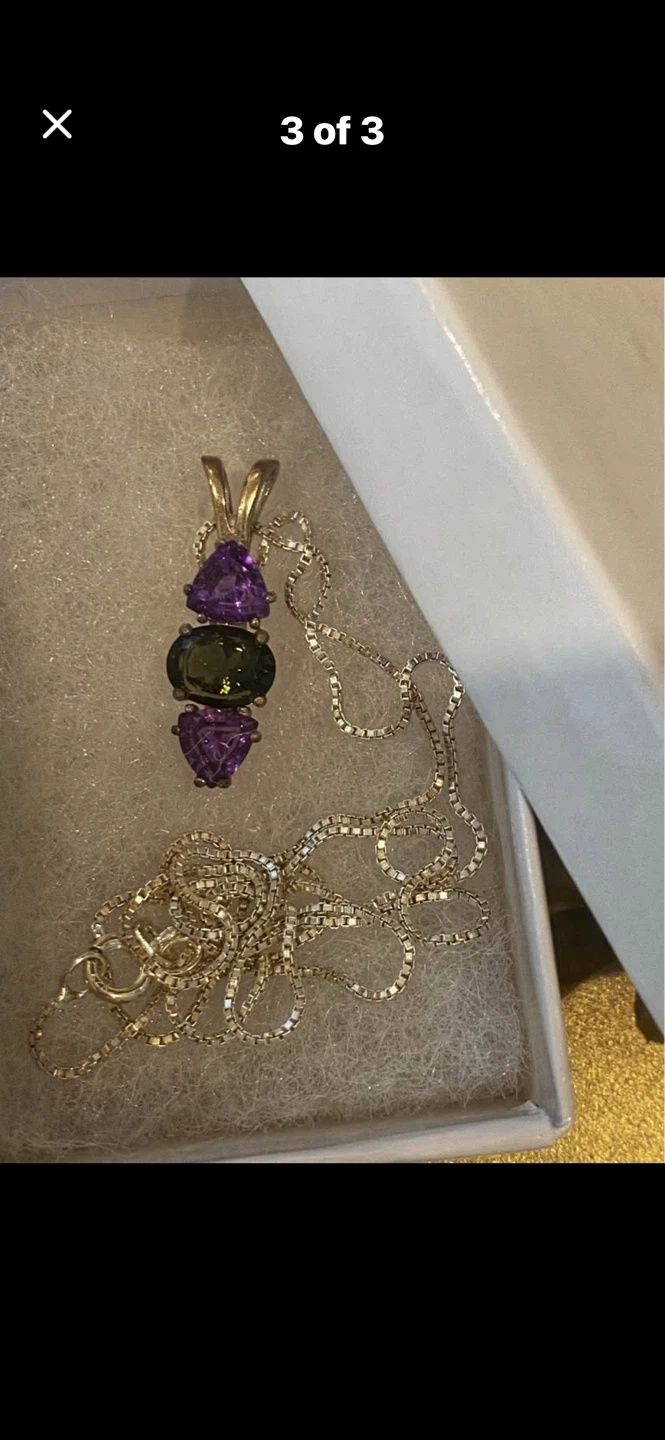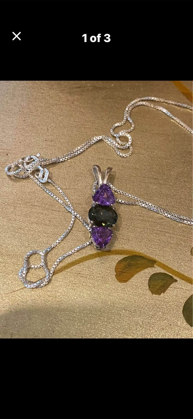 💚💜A beautiful sterling silver pendant necklace featuring three gemstones: two triangular amethyst stones and an oval green quartz stone. This necklace comes in a white jewellery box. It's a lovely piece for adding a touch of colour to any outfit!💜💚