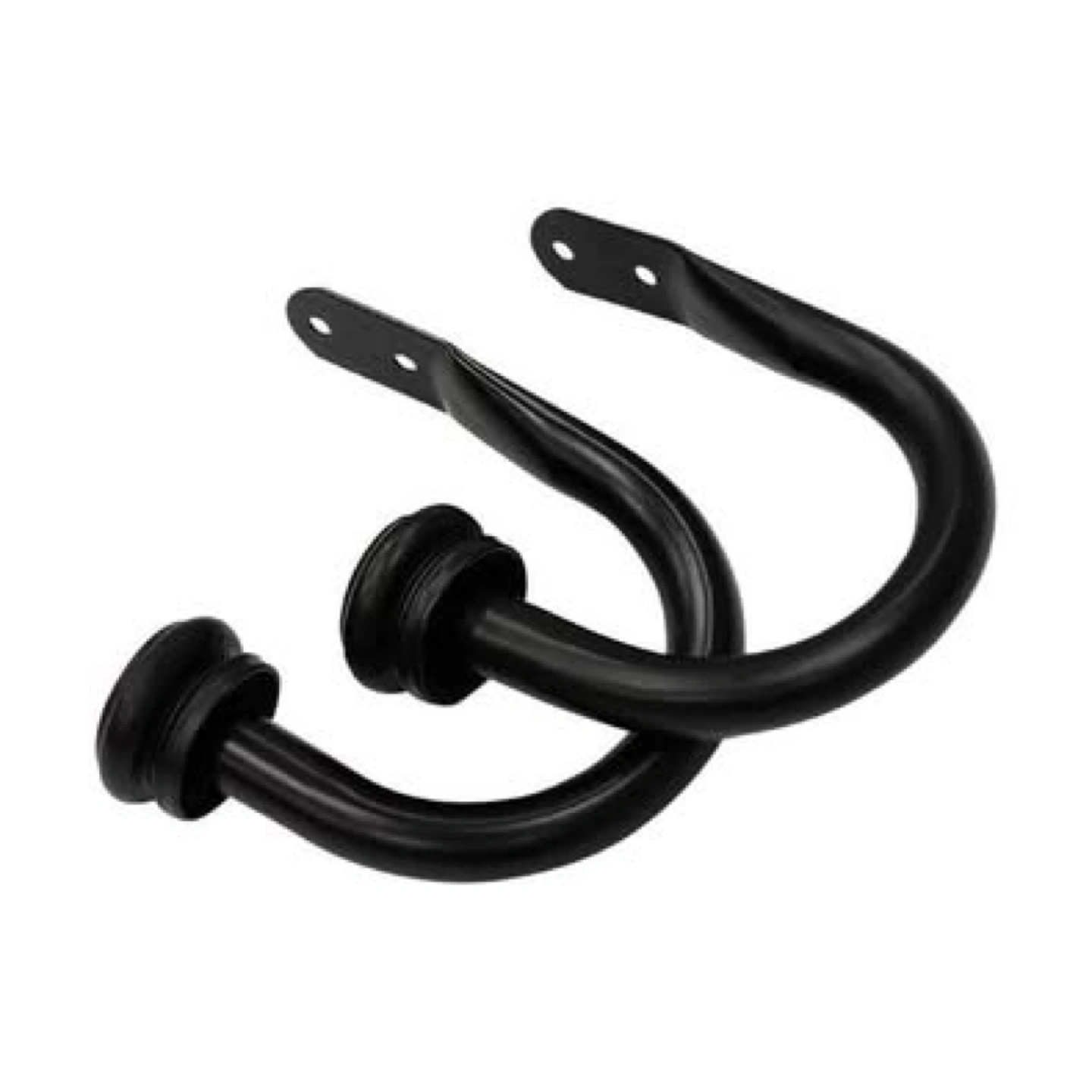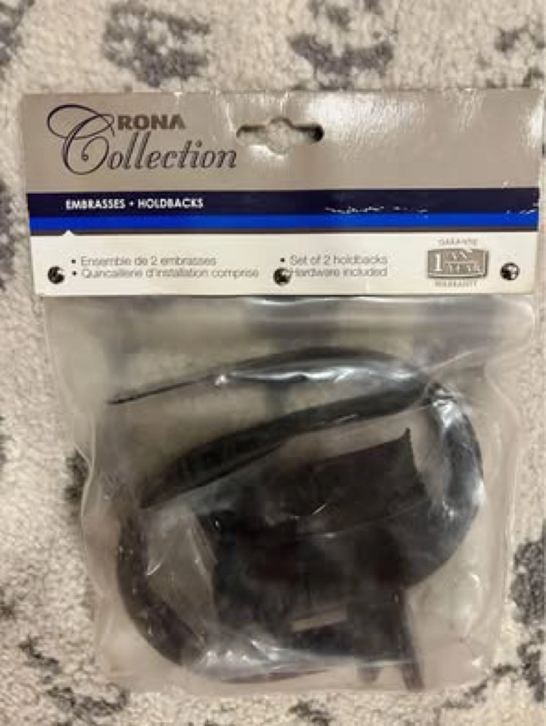 New in package. Dark brushed bronze metal curtain holdbacks. Set of two. Includes installation hardware. Simple, elegant design.