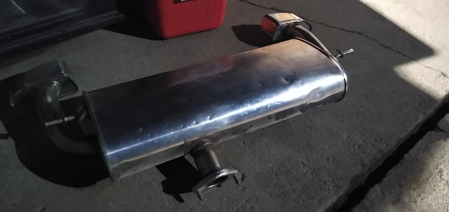 Stainless steel exhaust muffler. It's a universal fitment and looks to be in good condition. Muffler is approximately 24 inches long.