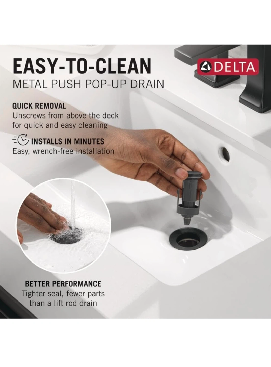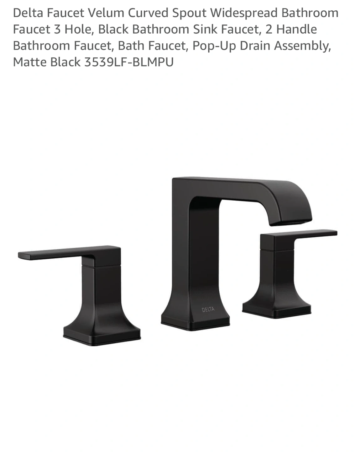 Selling a Delta Velum curved spout widespread bathroom faucet in matte black. It's designed for a 3-hole setup and includes a pop-up drain assembly. The spout reach is 5 inches, and the widespread width range is 4-16 inches. Easy to clean metal push pop-up drain!