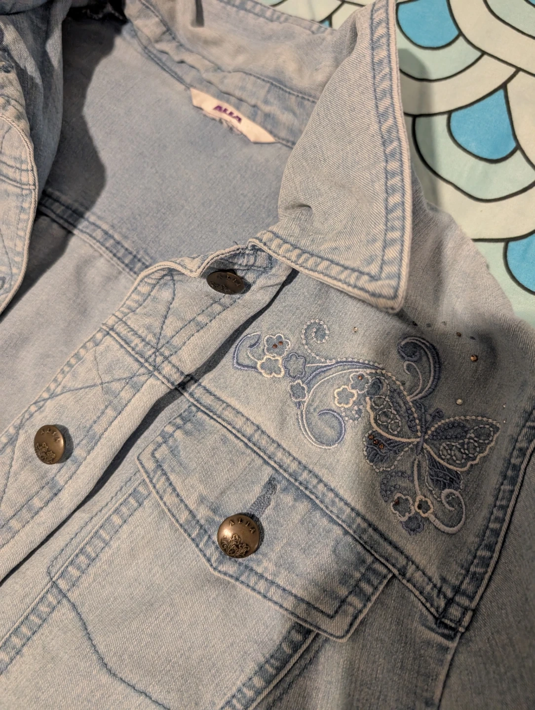 This light wash denim jacket features delicate butterfly embroidery on the chest pockets. It's made of soft denim and has a classic button-up front. The jacket's design makes it a stylish layering piece for any casual outfit. Size medium fits a bit bigger though. Asking only 5.00
