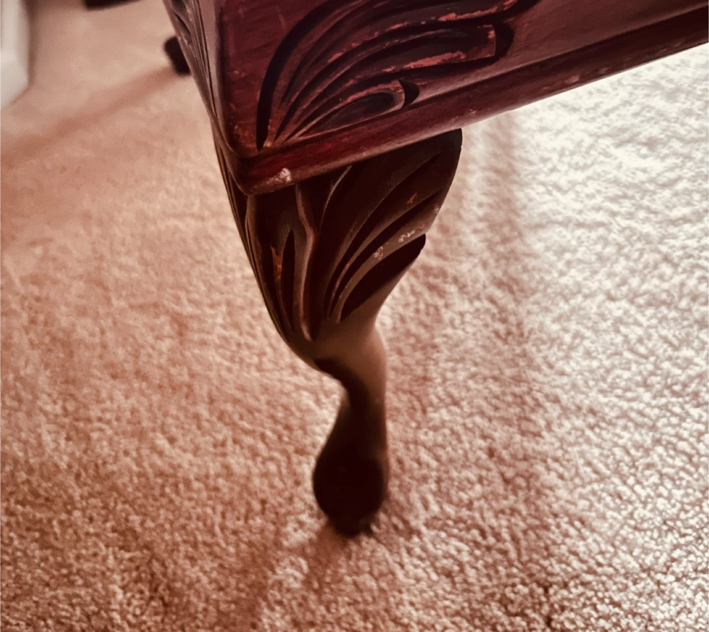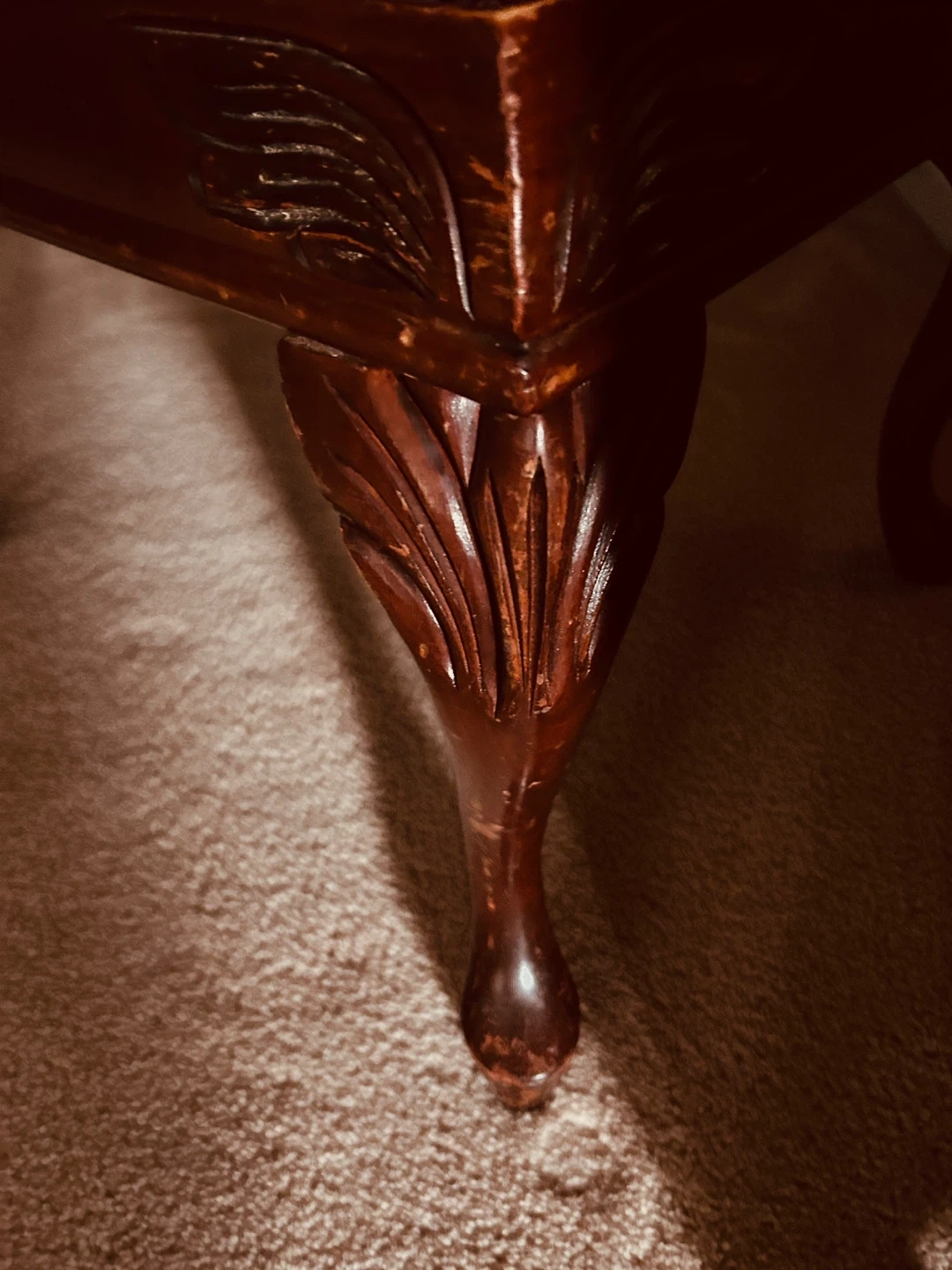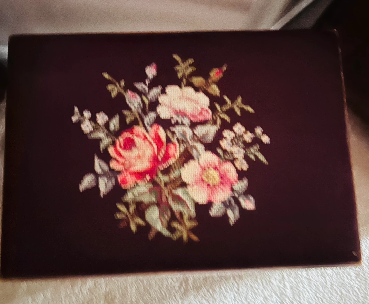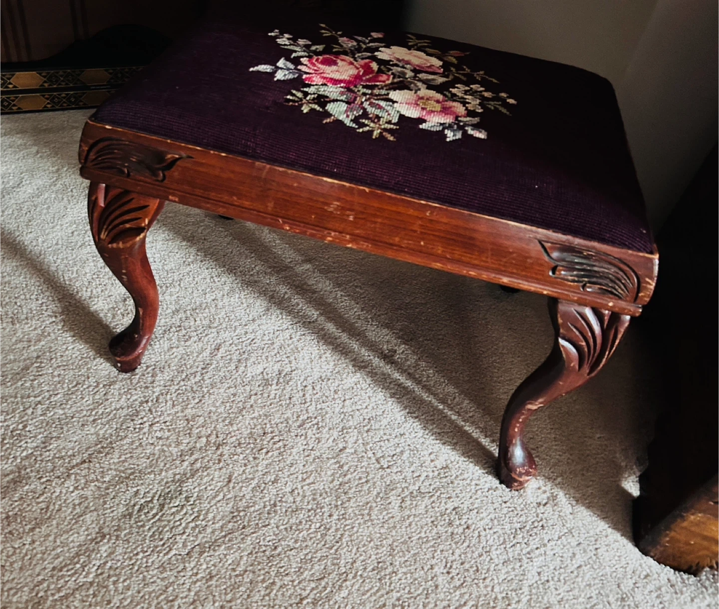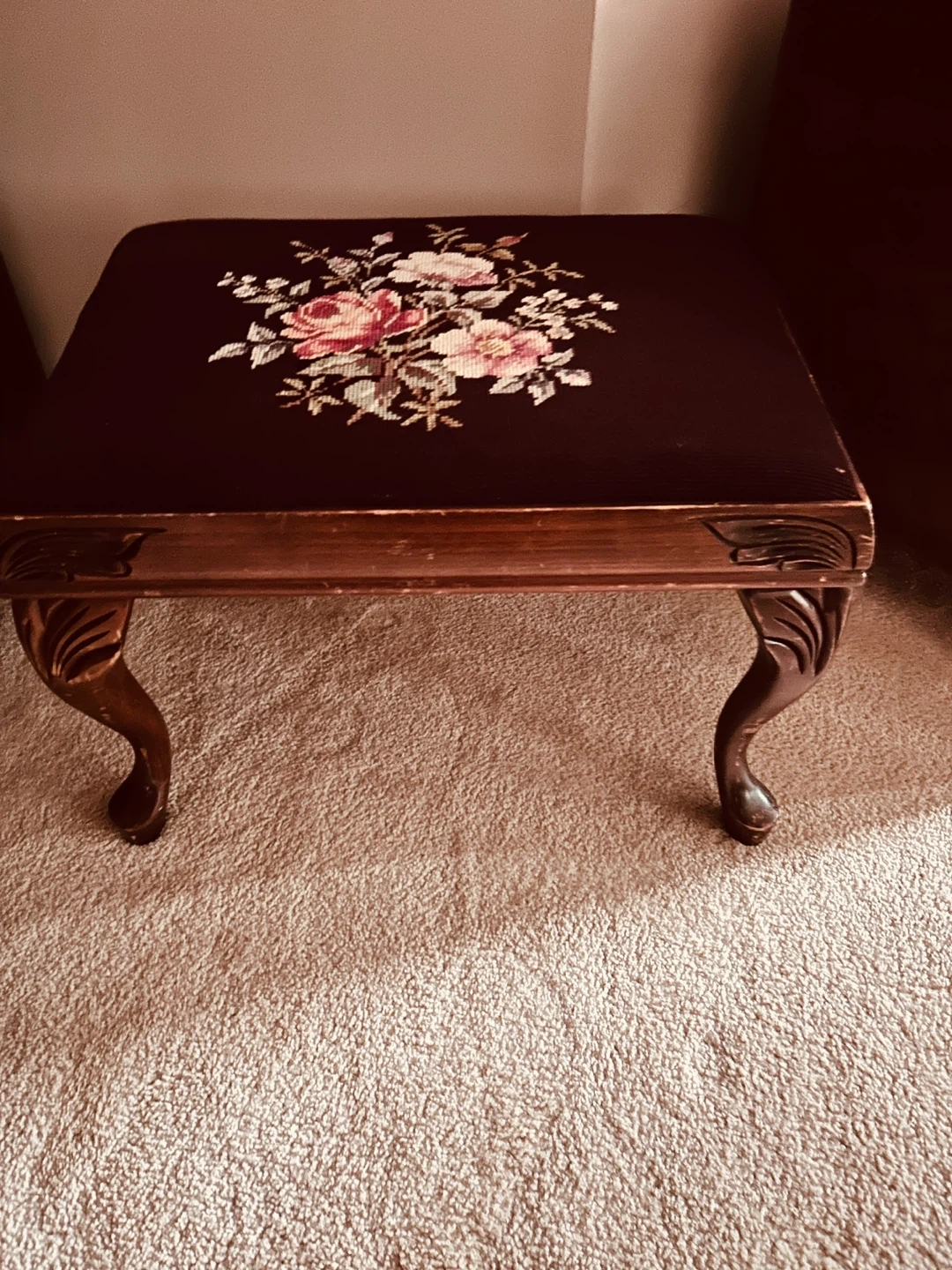 Lovely vintage footstool with a carved wooden base and a beautiful floral needlepoint top. Perfect for resting your aching feet after a long day.