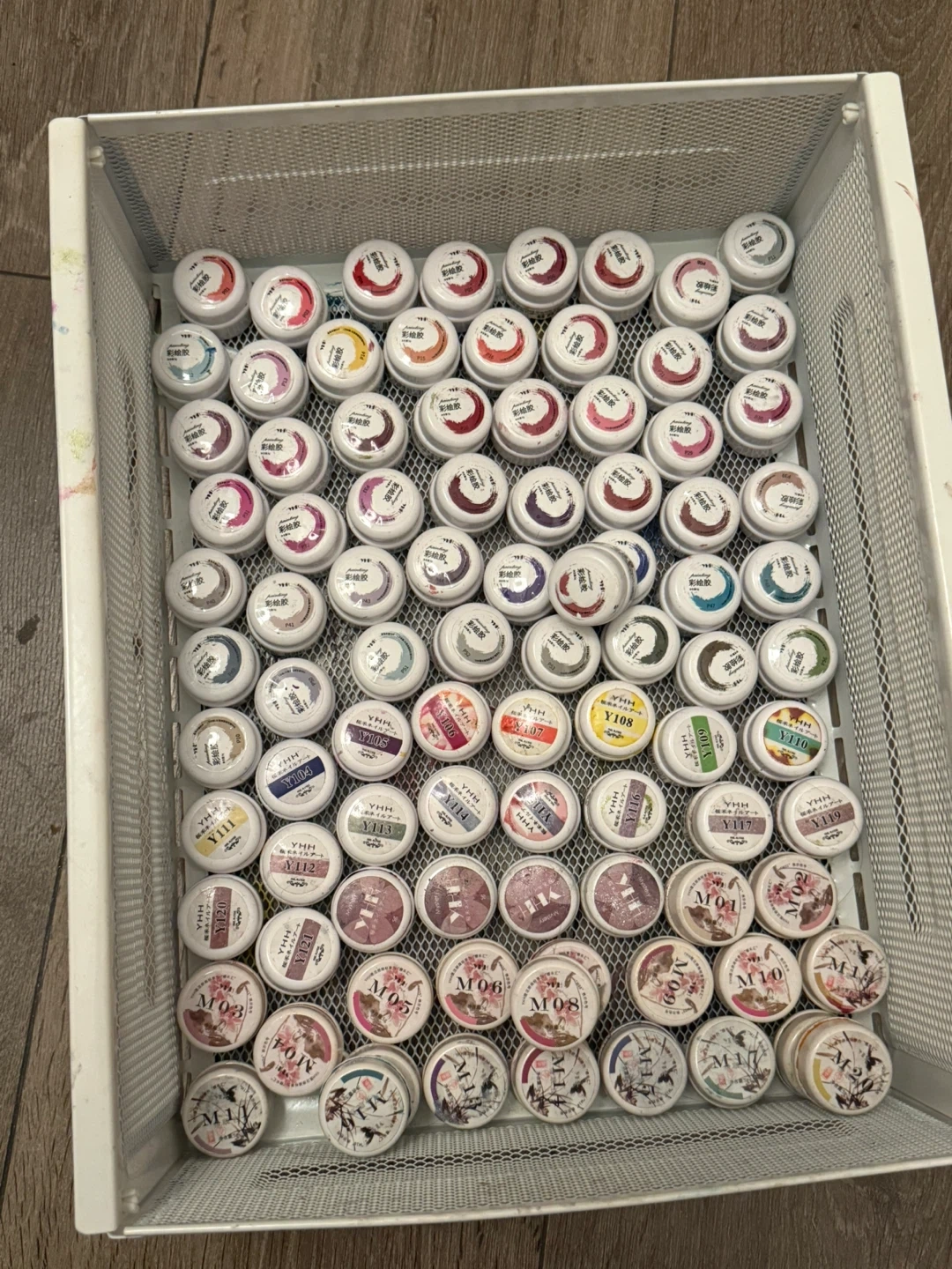 A collection of YHH Painting gel nail polish, featuring 56 assorted colours. Includes shades from the 'Sakura Garden' 10-colour set. Shades are labelled with Y/### and P## codes.