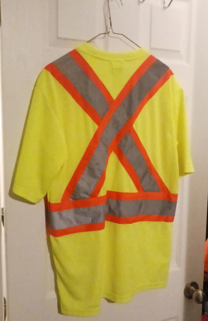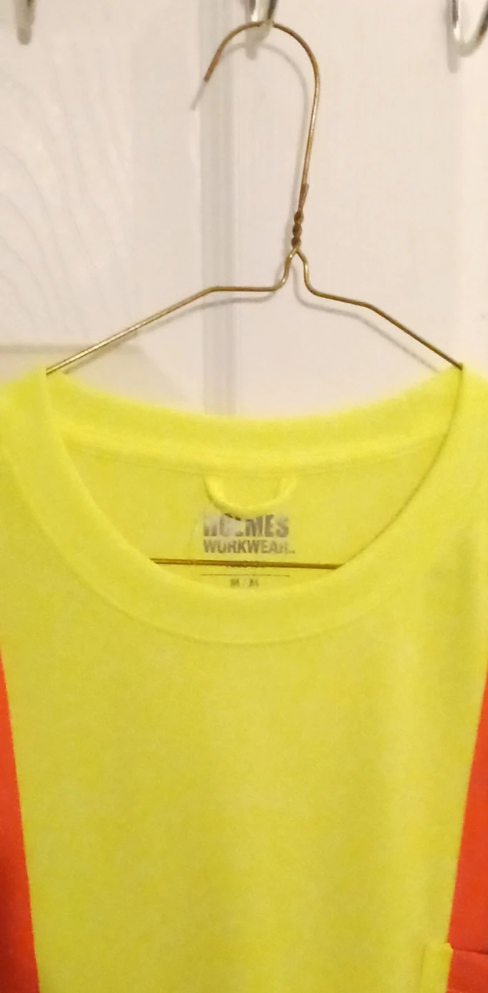 This is a Holmes Workwear high-visibility safety t-shirt. It's a bright yellow colour with reflective stripes on the front and back. The size is M/L. It's made for increased visibility on the job!