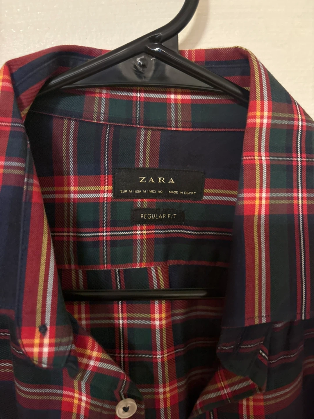 This ZARA men's shirt features a classic plaid pattern in a regular fit. It's a long-sleeve button-up style. Made for comfort and everyday wear.