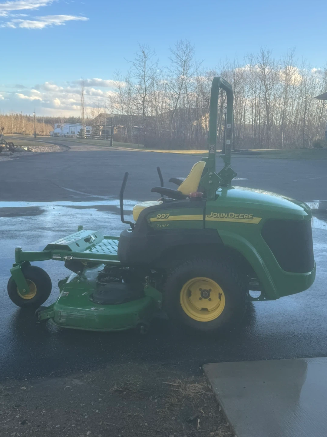 This is a John Deere 997 ZTRAK commercial zero-turn mower with a 72-inch deck. It has approximately 1421.5 hours on it. This mower is ready for your property maintenance needs! Low hours and always kept in heated garage