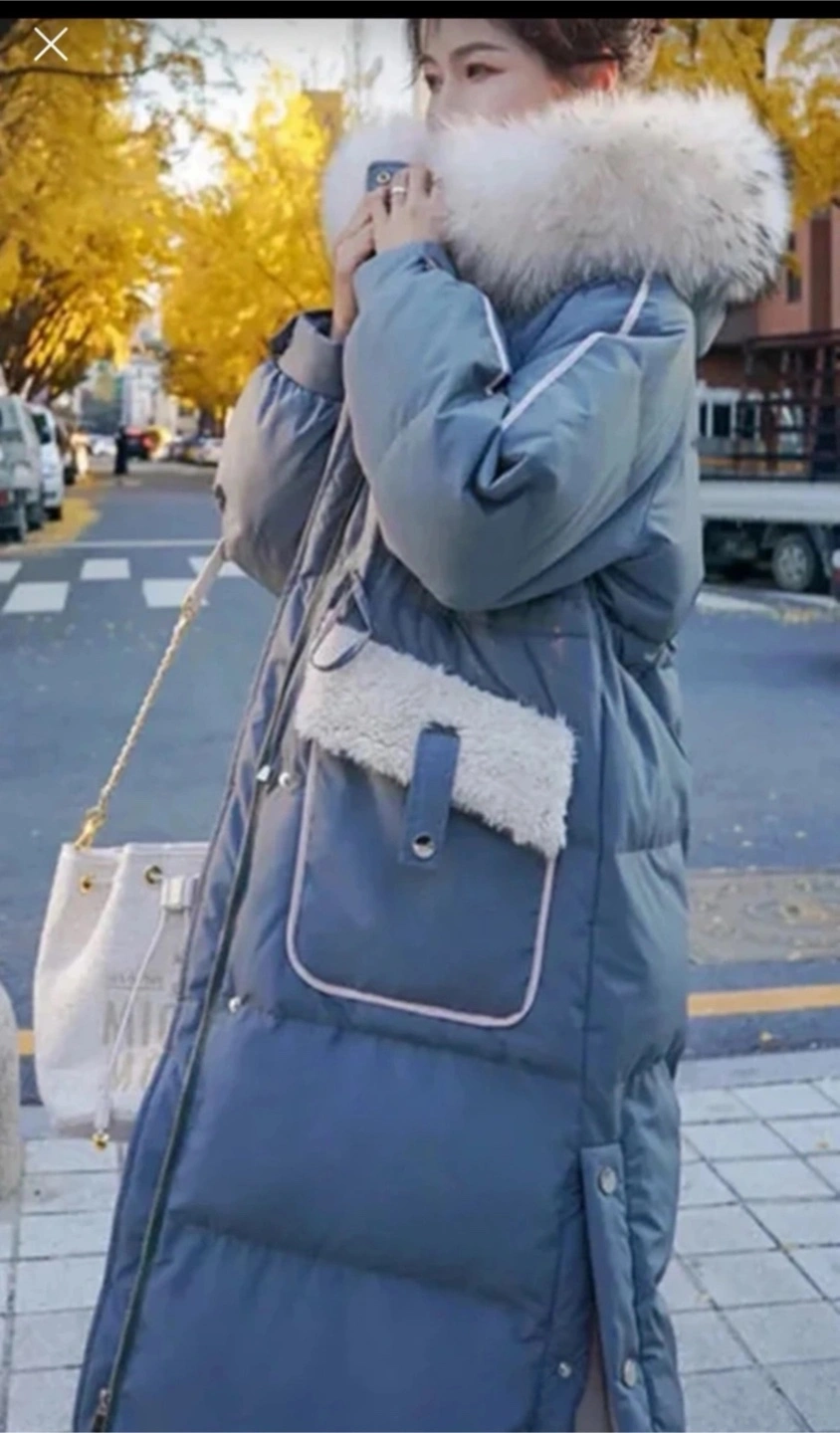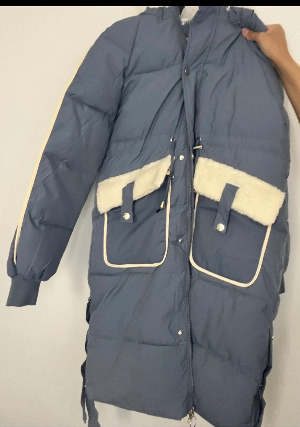 A stylish puffer coat in a lovely blue colour. It's got a fur-trimmed hood and some cute fur pocket details. Perfect for keeping warm this winter!
