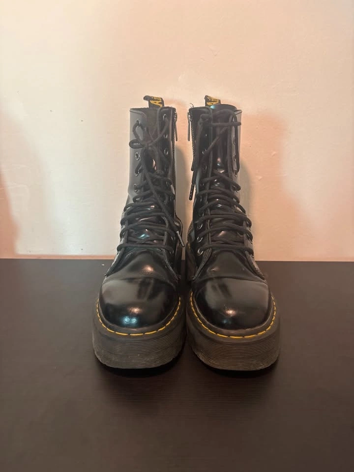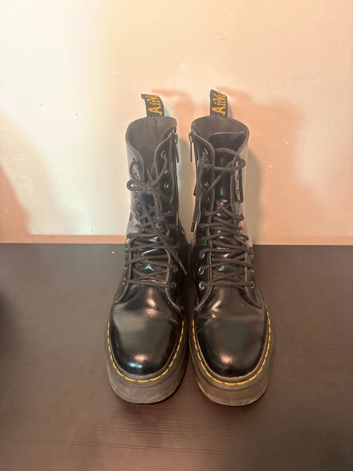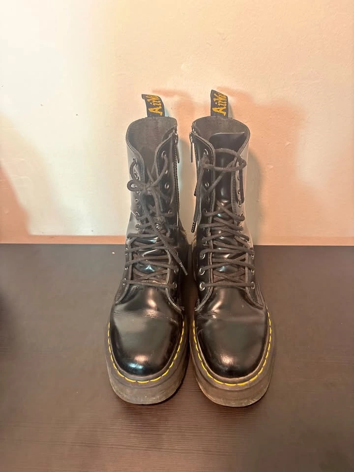 Super cute chunky black platform boots with lace-up front and that bold yellow stitching detail. Perfect for streetwear, grunge, alt fits, or just adding some edge to a basic outfit. They’ve been worn but still in great shape — lots of life left in them. Sturdy, comfy, and easy to style with jeans, cargos, skirts, literally anything.