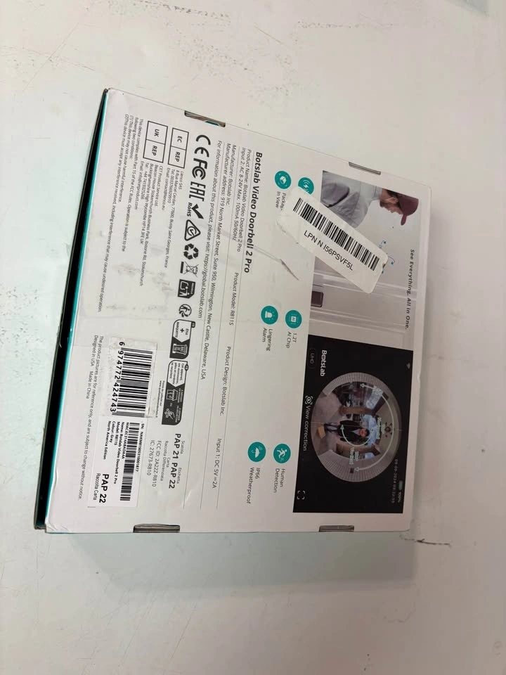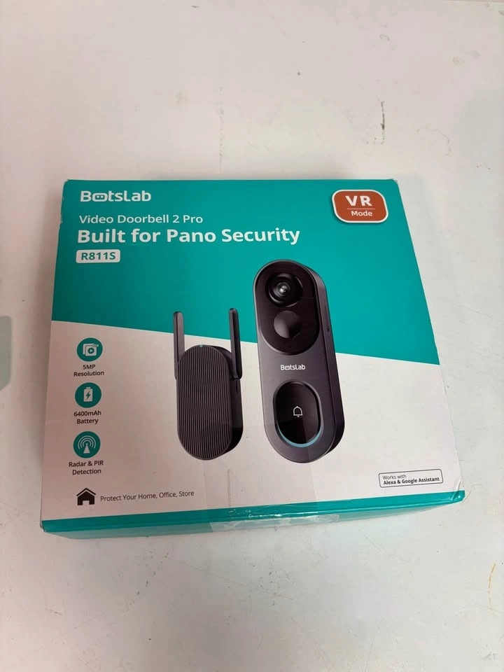 Brand new, never used. Still in the box. This is the Botslab Video Doorbell 2 Pro (model R811S), built for wide panoramic security and super convenient if you don’t want to deal with constant recharging. Key features: 5MP high-resolution video – very sharp image. Long-lasting 6400mAh battery (great battery life). Radar + PIR motion detection for accurate alerts. Wide panoramic view (Pano Security / VR mode) – see more of your front door. Two-way audio – talk to visitors from your phone. Works with Alexa & Google Assistant. Suitable for home, office, or small business. Wireless, clean install, and reliable. Perfect if you want solid security without monthly hassle.