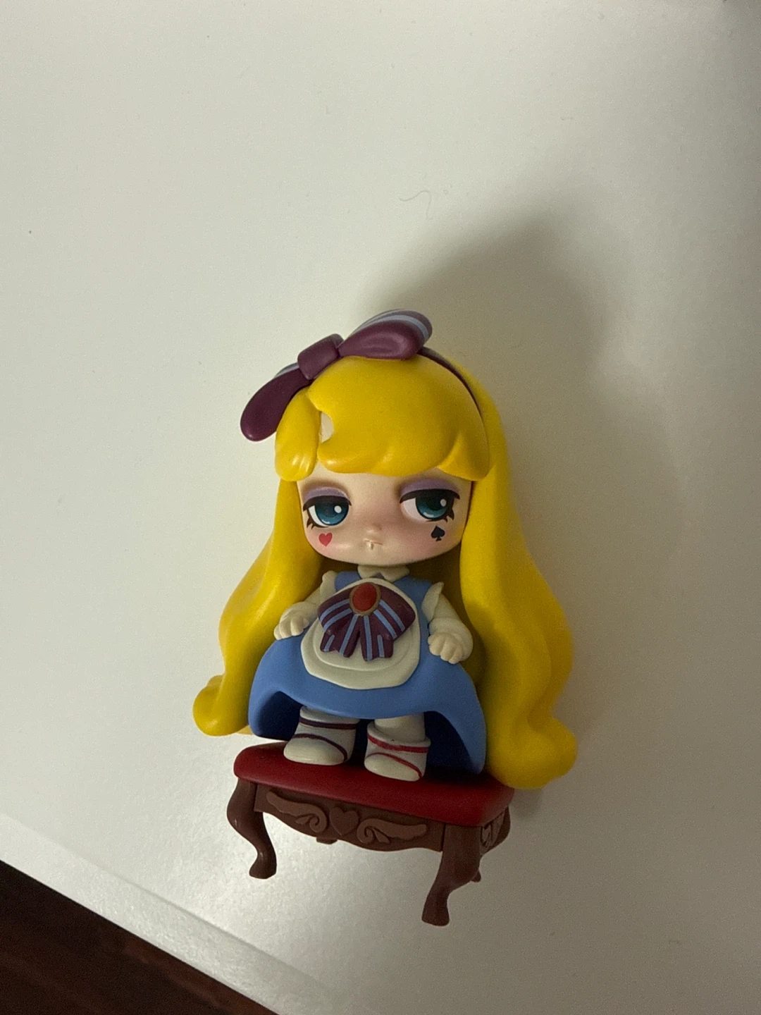 This is a cute figurine inspired by Alice in Wonderland. It features a detailed outfit with a blue dress and apron, and blonde hair. It sits on a small red stool with decorative legs. This collectible item is great for display on a shelf or desk.